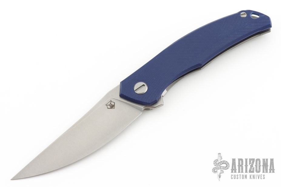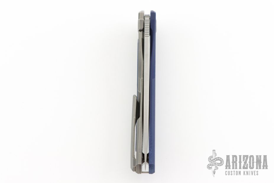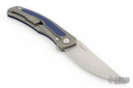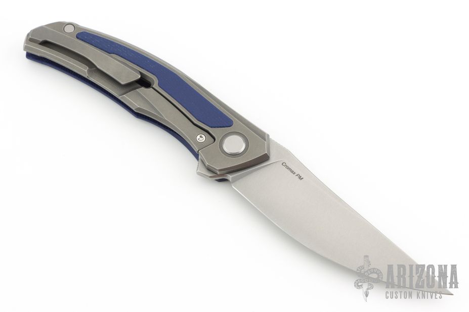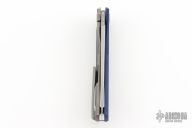 This Quantium Ursus by Shirogorov features a tumble finish blade with notched thumbrest and flipper. The handle has a Dark Blue G-10 Scale, tumbled and milled titanium frame, Dark Blue G-10 inlay and backspacer, tip up titanium clip with hidden screws. Rides on MRBS, nice detent, lockup and blade seating. Cromax PM blade steel. Comes with original box and COA. Excellent condition.