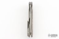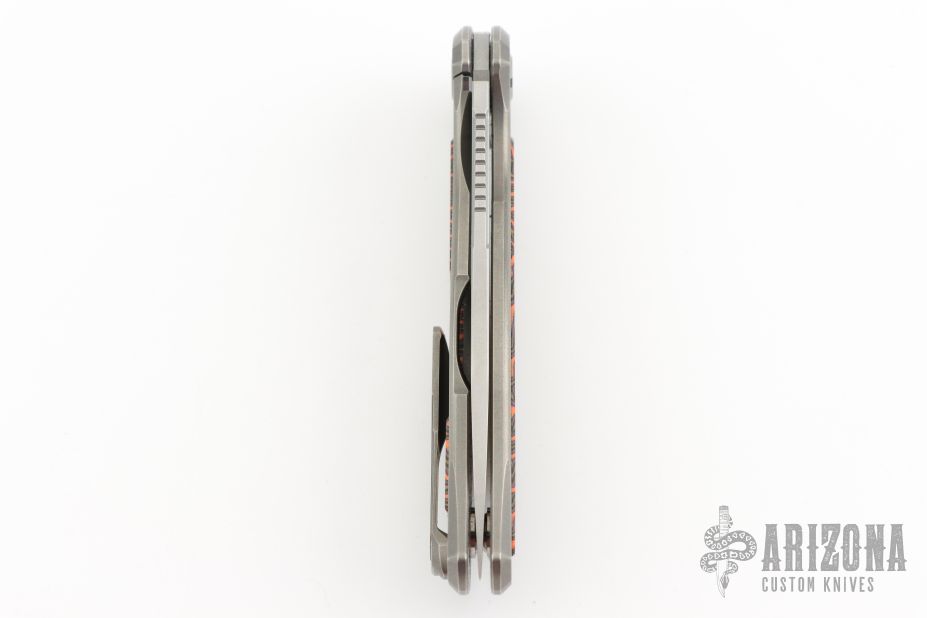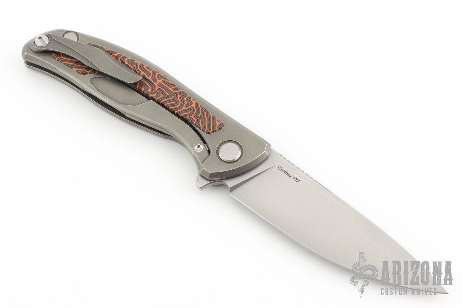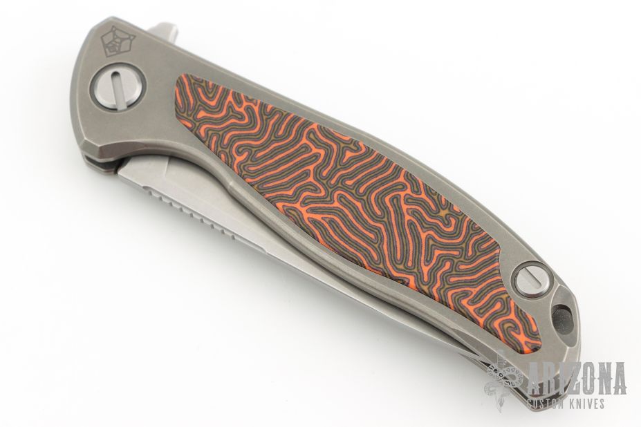 This F95NL framelock from Shirogorov features a flat ground tumble finished Cromax PM blade with notched flipper. The handle has a tumble finished titanium frame with black/orange crazy micarta inlay complimented by a matching tip up clip and a single titanium barrel spacer at the butt along with a lanyard hole. Excellent lockup, strong detent, and nice seating. Excellent condition. Comes with original box and COA.