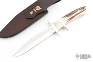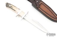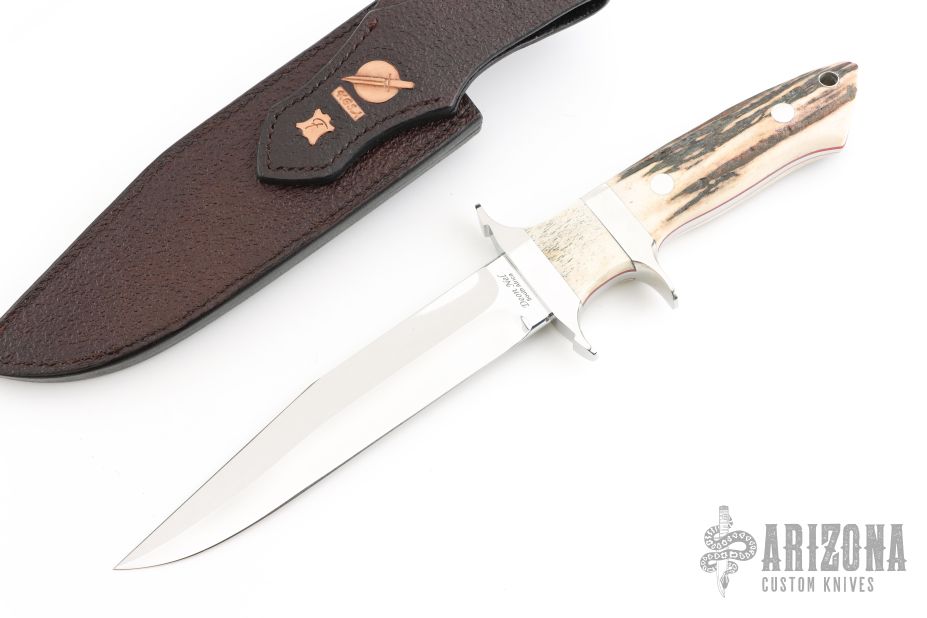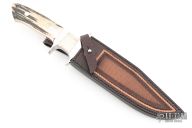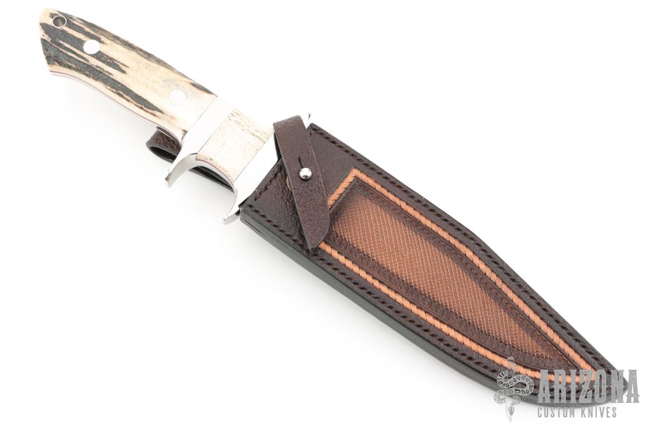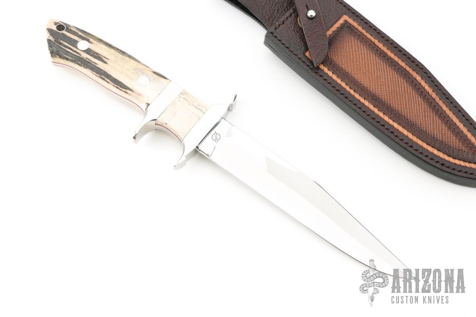 This Sub-Hilt Fighter by Deon Nel features a mirror polished blade with a sharpened top edge, .234" blade stock and 1.192" blade depth, full tapered tang construction. The handle has a mirror polished 303 stainless steel guard and sub-hilt, stag scales with red liners. Comes with a hand tooled brown leather sheath, zippered case and COA dated 2024. Excellent condition.