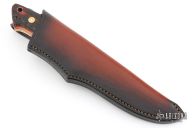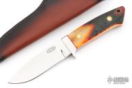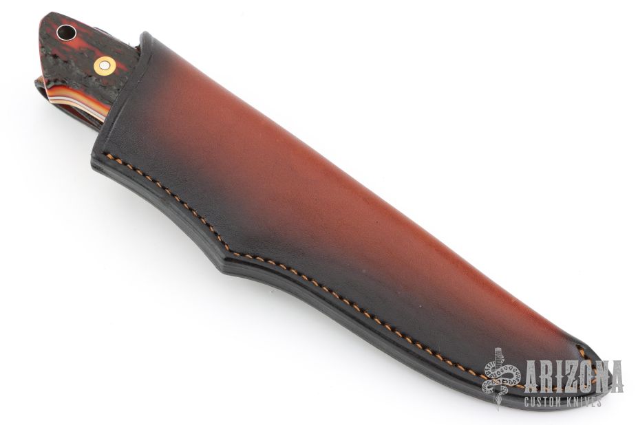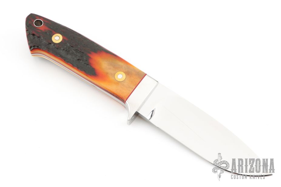 This Loveless Style Drop Point Hunter by Shaun Bruwer features a mirror finished blade with .207" blade stock and 1.148" blade depth, full tapered tang construction. The handle has stainless steel guard, stag scales with red liners and lanyard hole in pommel. Comes with a brown leather sheath and a zippered case. Excellent condition.