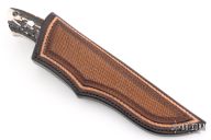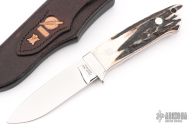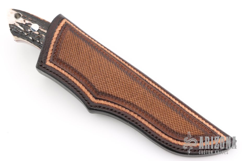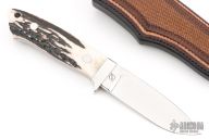 This hunter by Deon Nel features a mirror polished blade with .231" blade stock and 1.094" blade depth, full tapered tang construction. The handle has mirror polished 303 stainless steel bolsters, stag scales with red liners. Comes with a hand tooled brown leather sheath, zippered case and COA dated 2024. Excellent condition.