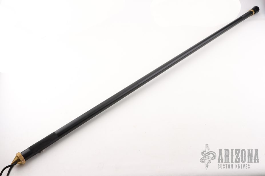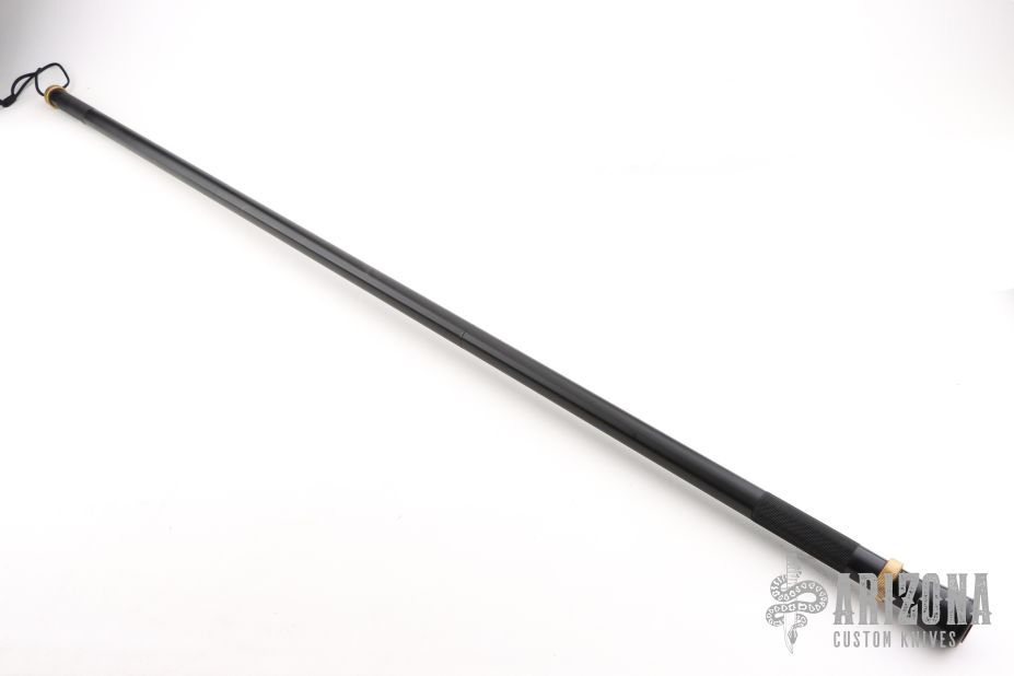This 52" Black aluminum 3-Piece survival staff with pointed brass skull crusher butt with compass. This one has a brass coupler with a rubber end that can be used as a staff, or removed and the knife added to the end to make a spear. Comes with a canvas bag to store it. Excellent condition.