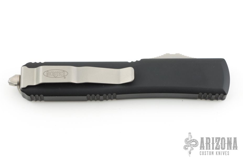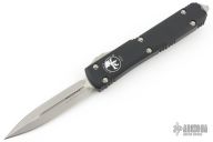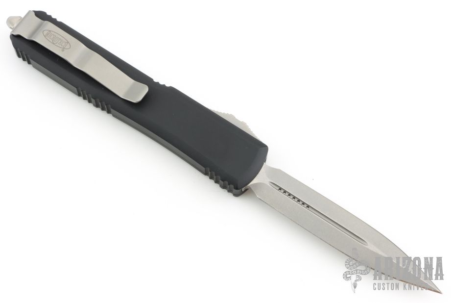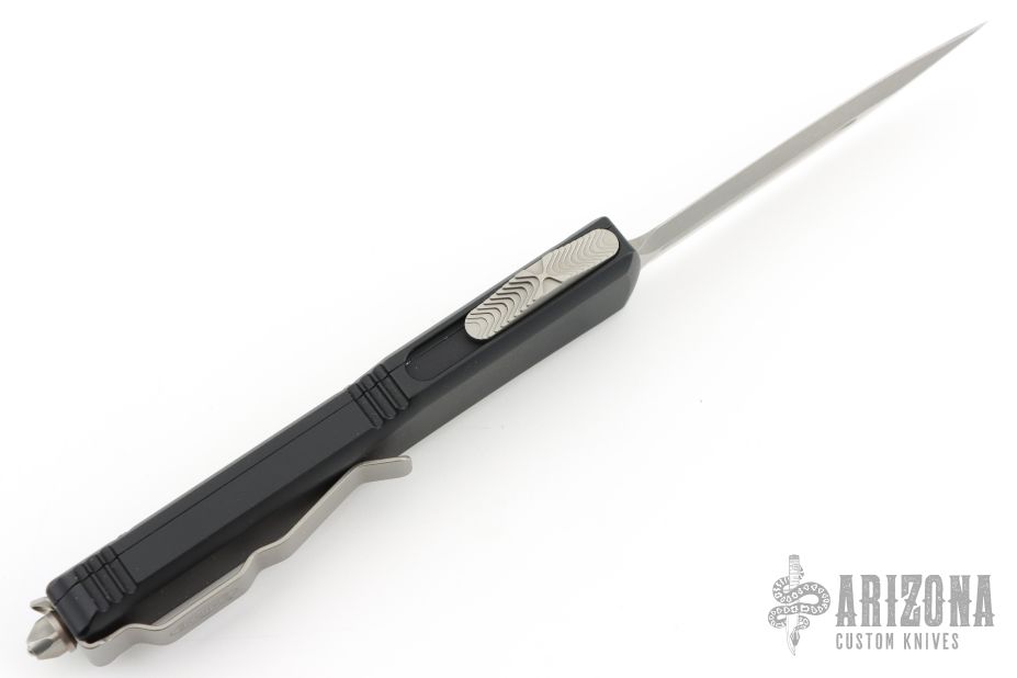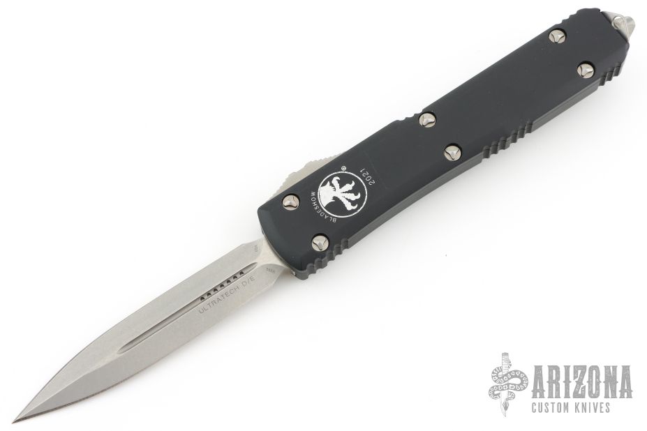 This Ultratech by Microtech is the 2021 Blade Show Special. It features a dagger ground double-edged stonewashed blade. The handle has a black aluminum frame with blasted stainless hardware and tip down clip. Comes with original box and papers. From the 2021 Blade Show. Has a few light scuffs and scratches, excellent condition otherwise.