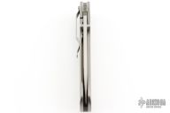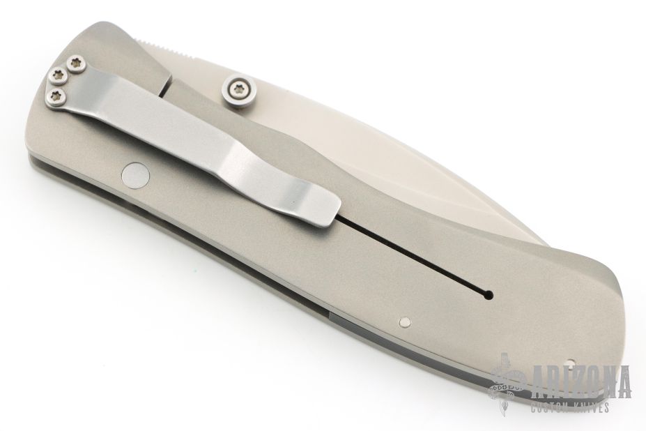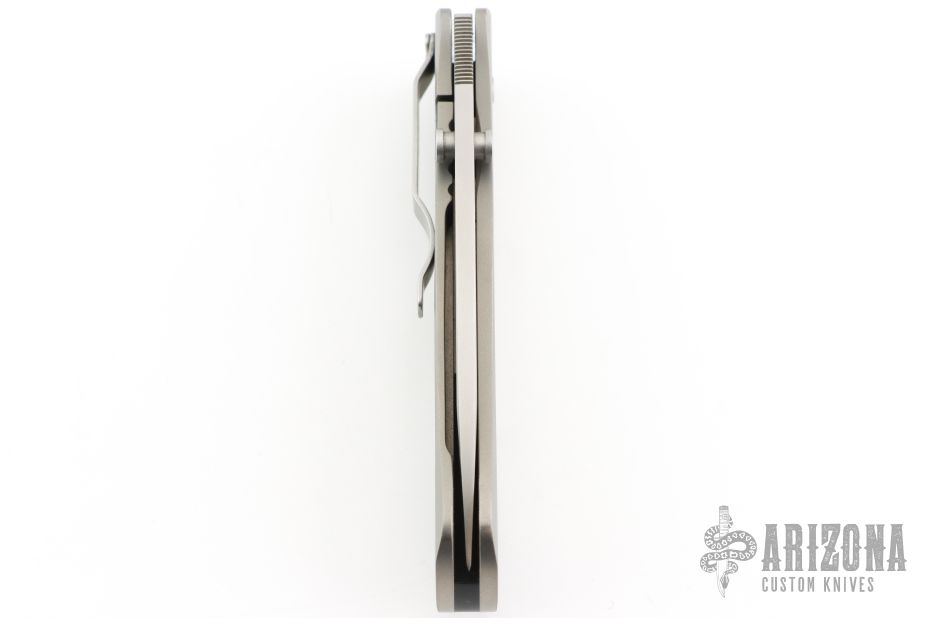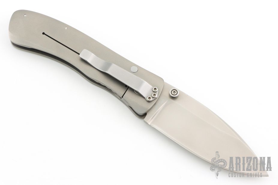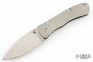 This small Model 2 linerlock folder by Mike Obenauf features a bead blasted drop point blade with notched thumbrest and dual thumbstuds. The handle has bead blast finished titanium bolsters scales, black backspacer and a tip down stainless steel clip. Smooth action. Nice detent, blade seating and lockup. Excellent condition. Comes with zippered case.