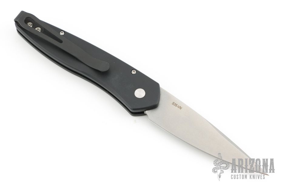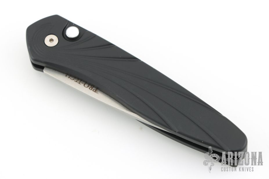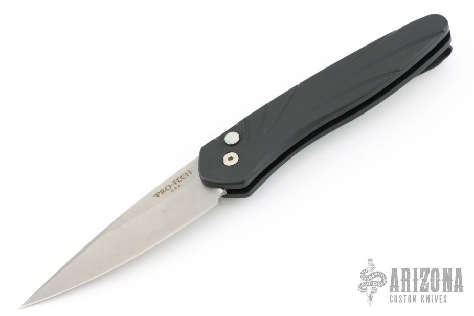 This Newport by ProTech Knives features a stonewashed spearpoint blade and black aluminum handle with 3D Wave milling pattern, tip up black stainless steel clip. Comes with original box and papers. Excellent condition.