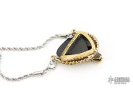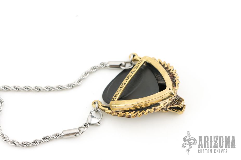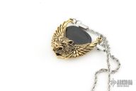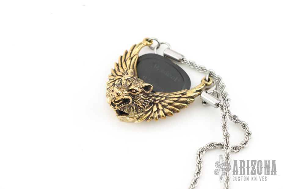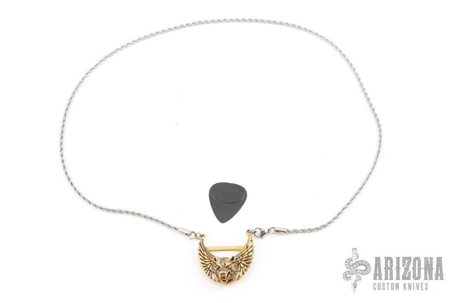 Hand Made Winged Wolf Guitar Pick Holding Pendant by R.N. Sils dated 2014. Hung on a stainless steel chain. Excellent condition.