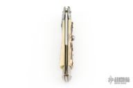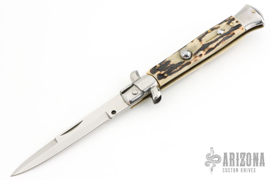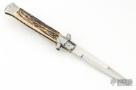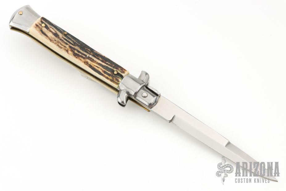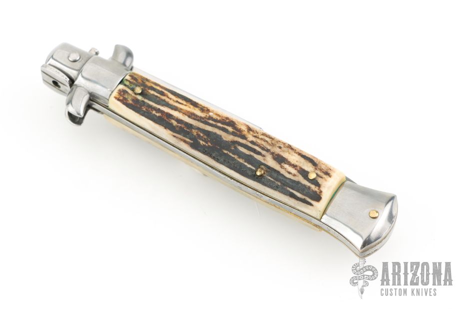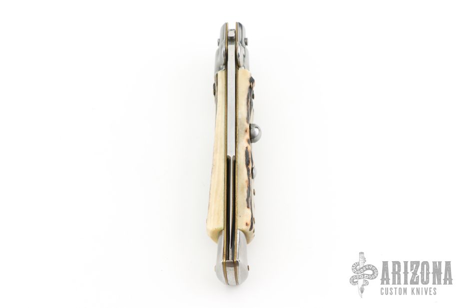 This Swivel Bolster features a polished bayonet ground blade. The handle has stainless steel bolsters, front and rear, stag scales, brass liners, steel spring. Has some light scratches, otherwise excellent condition.