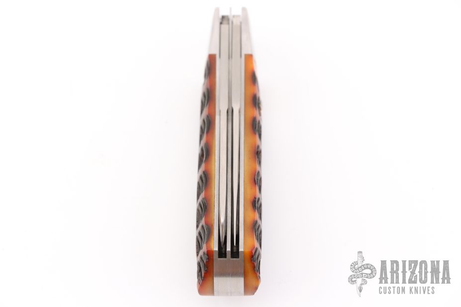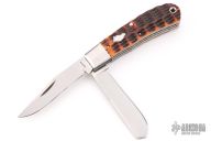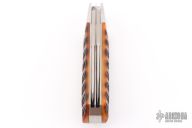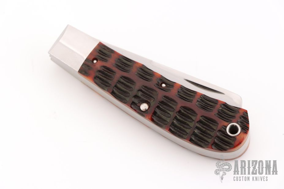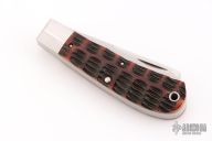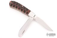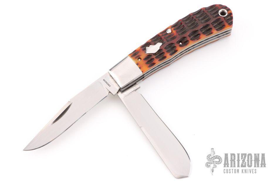This Slipjoint by Luke Swenson features hand rub satin finished blades with nail nicks. The handle has pinched stainless steel bolsters with integral liners, jigged bone covers, stainless steel escutcheon, stainless steel liners and spring. Has half-stops, flush in all positions. Comes with maker's zippered case. Excellent work. Has a couple light scratches, excellent condition otherwise.
