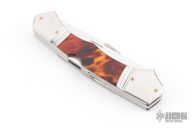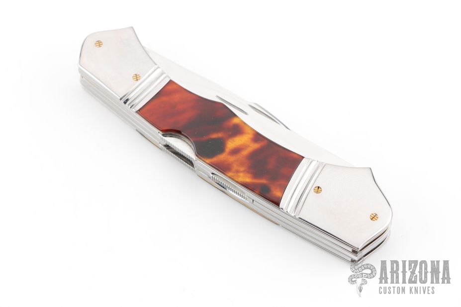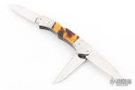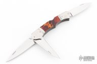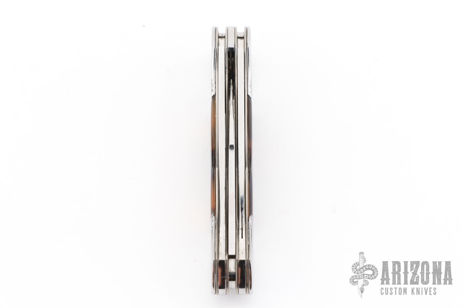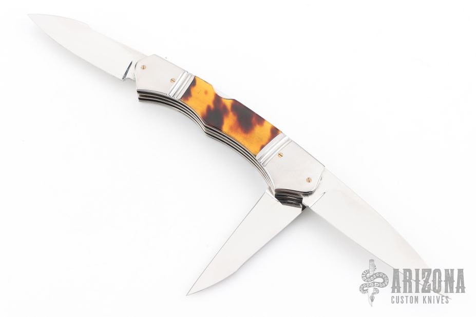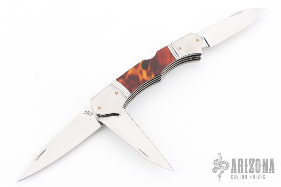 This 3-Blade Lockback by Salvatore Puddu is STUNNING! It features mirror polished blades with nail nicks. The handle has fluted and dovetailed stainless steel bolsters, amber scales, stainless steel liners, polished stainless steel backspacers with notched lock releases. Has 18k gold screws. Nice lockup and blade seating. Excellent condition.