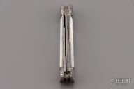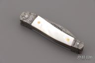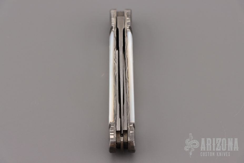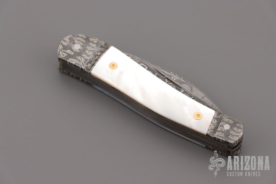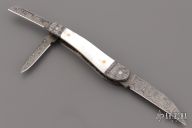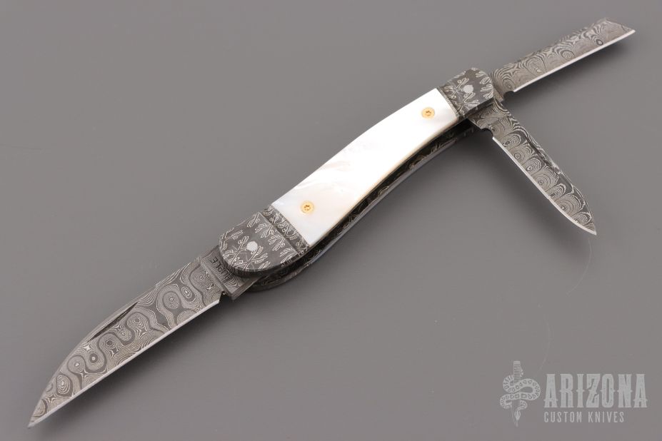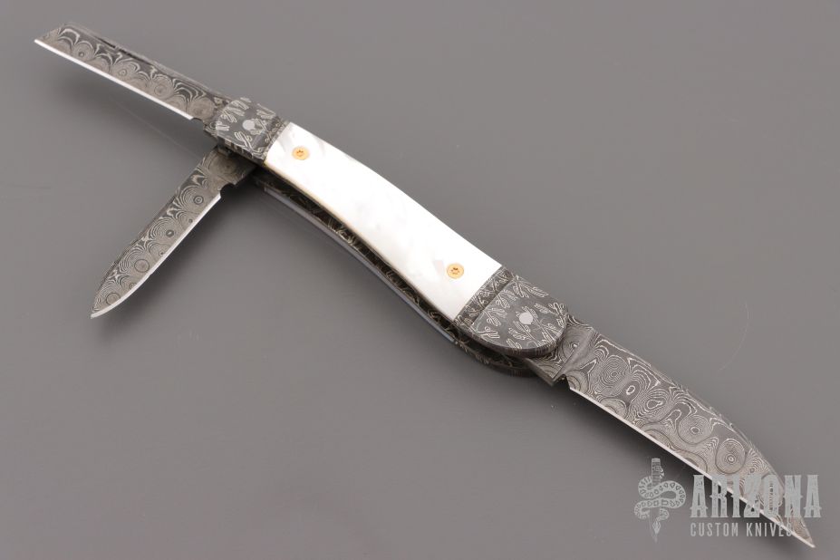 This Three-Blade Whittler by Bill Ruple features Damascus finished blades with nail nicks. The handle has fulted Mosaic Damascus bolsters, pearl covers, gold screws, Damascus liners and Damascus springs. Half stop blade positioning on all blades, flush in all positions. Nice walk and talk. Includes a padded zippered case. Has a couple light scratches, excellent condition otherwise.