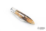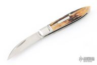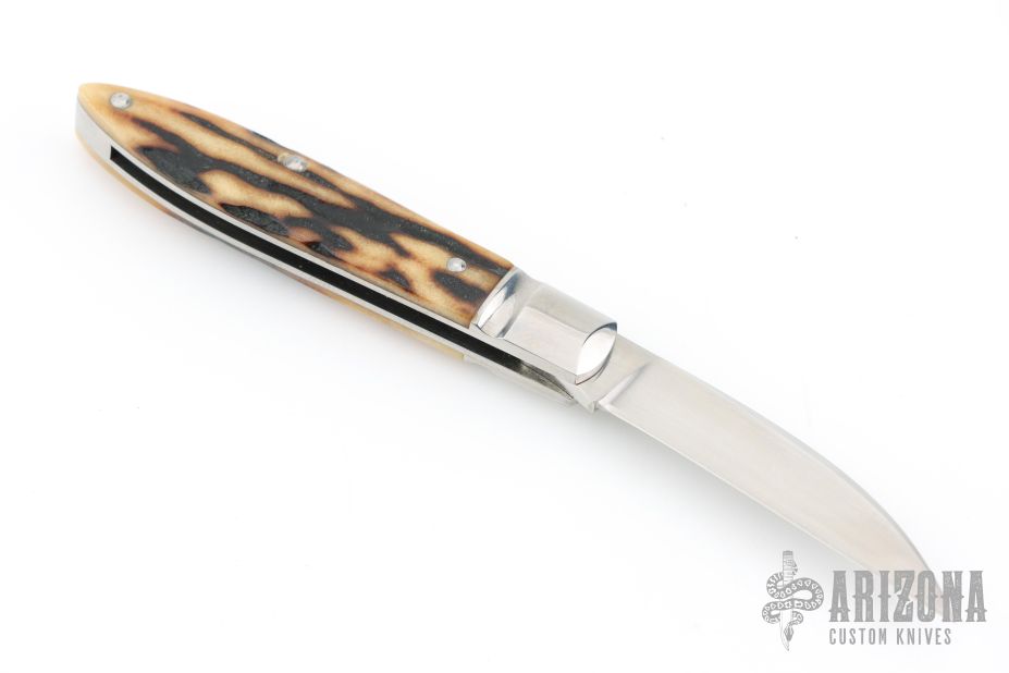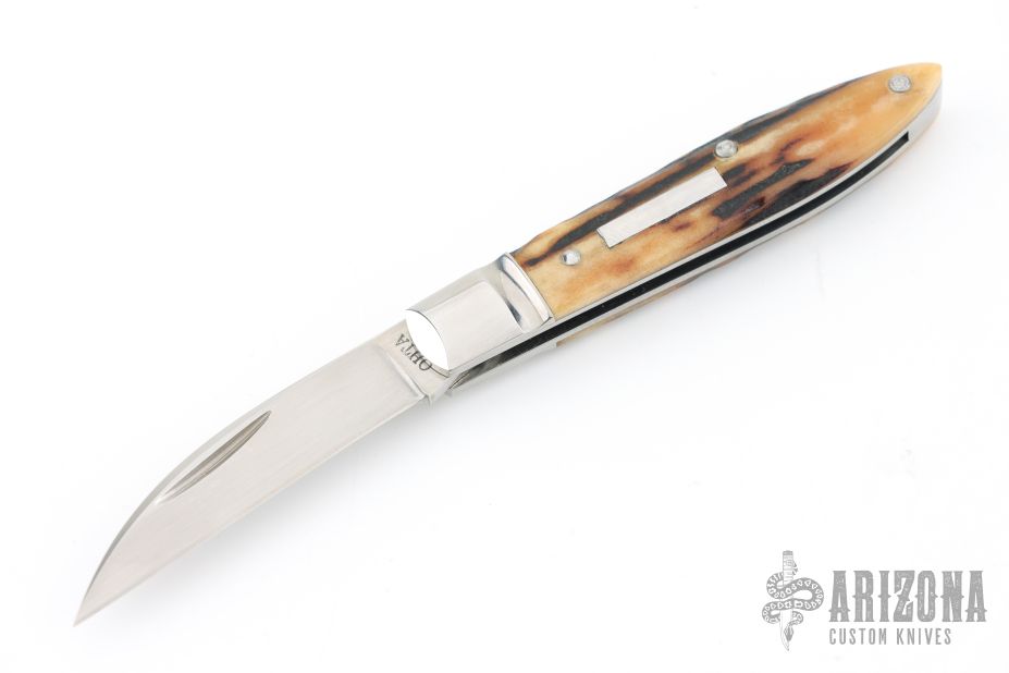This slipjoint by Hiroaki Ohta features a hand rub satin finished blade with nail nick. The handle has mirror polished and fluted stainless steel bolsters, stag covers with stainless steel escutcheon, stainless steel liners and spring. Has half-stop, flush in all positions. Comes with a zippered case. Has a few very light scratches, otherwise excellent condition.