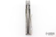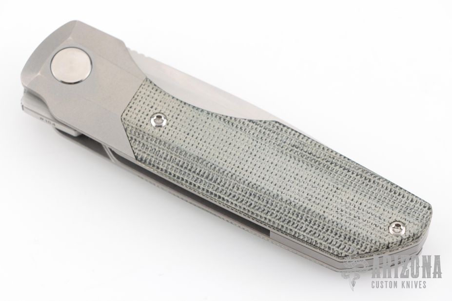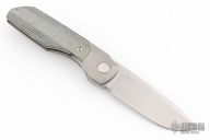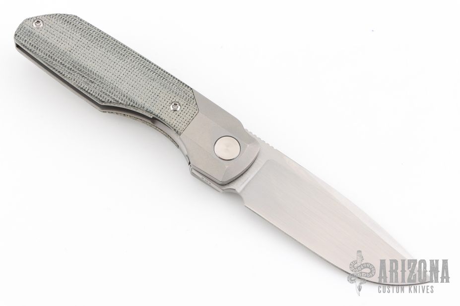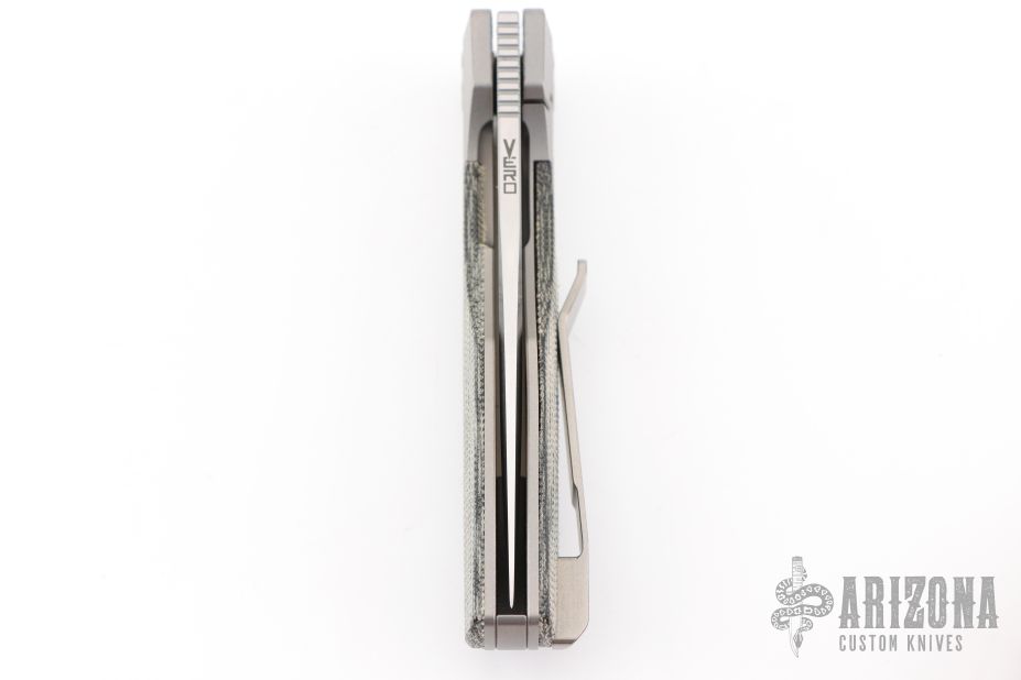 This Synapse First Run Folder by Vero Engineering features a hand rub satin finished blade with notched thumbrest and flipper. The handle has a bead blast finished titanium frame with canvas micarta scales, tip up titanium clip with hidden screws. Rides on bearings, nice detent, lockup and blade seating. Comes with zippered case and COA #154. Excellent condition.