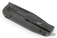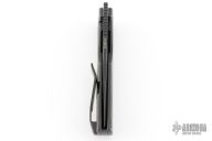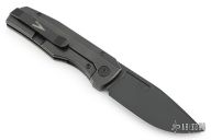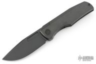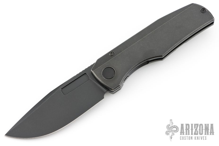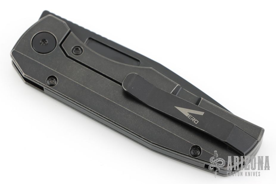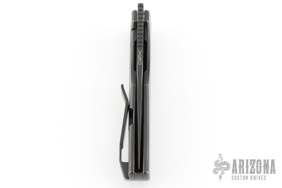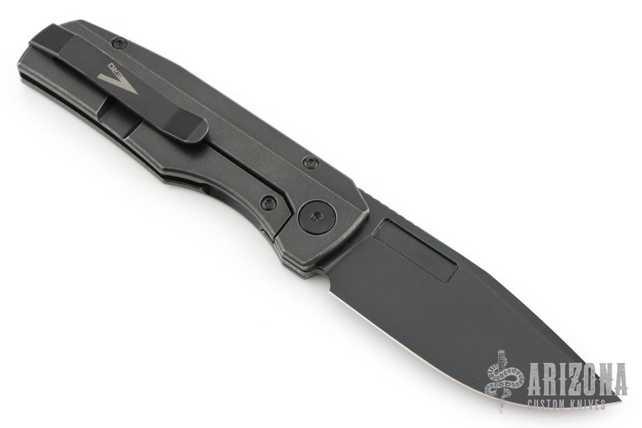 This Axon First Run Folder by Vero Engineering features a black finished blade with notched thumbrest and thumbhole. The handle has a black titanium frame with stainless steel lockface incert, tip up clip with hidden screws, and black backspacer with lanyard bail. Rides on bearings, nice detent, lockup and blade seating. Includes a padded zippered case, box and coa. Excellent condition.