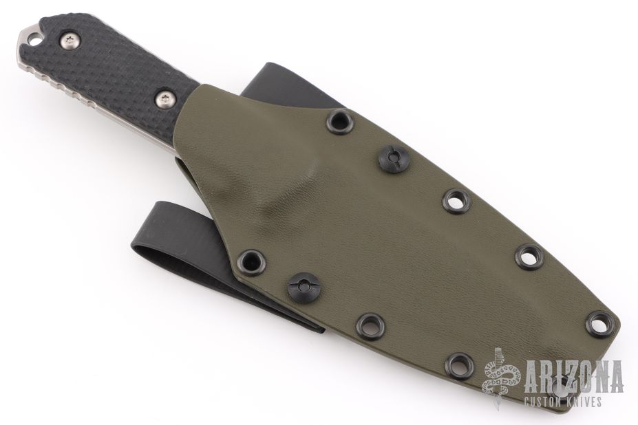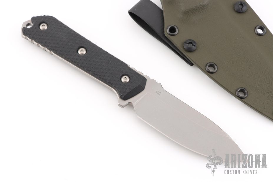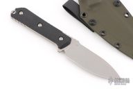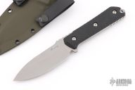 This knife by Lucas Burnley features stonewash finished blade with notched thumbrest, .155" blade stock and 1.365" blade depth, full tang construction. The handle has checkered black canvas micarta scales. Comes with original box, shop rag, OD green kydex sheath, and COA.