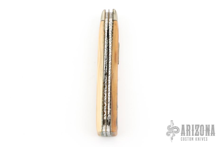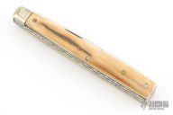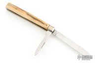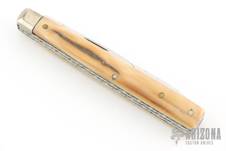 This Doctors Knife slip joint by Case Knives features a drop point blade with nail nick and file-worked blade spine. The handle has nickel silver bolsters, file-worked brass liners, mammoth ivory covers, and file-worked stainless springs. Has a few light scratches, otherwise good condition.
