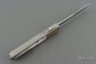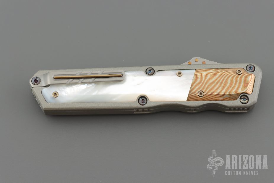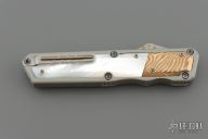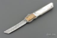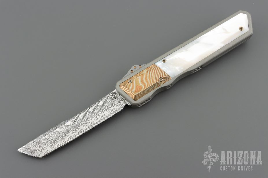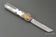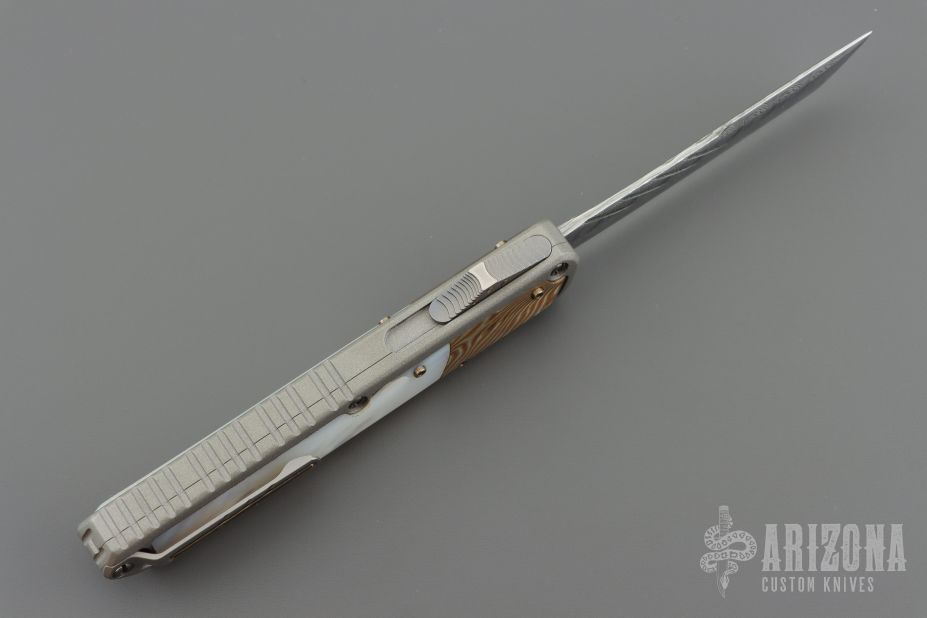 This OTF by Patrick Famin features a Damasteel blade.  The handle features an aluminum frame with pearl and mokume inlays.  Stainless pocket clip.  Includes COA and a padded zippered case.  Light scratches visible on the inlays otherwise the knife is in Excellent Condition.