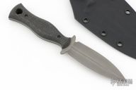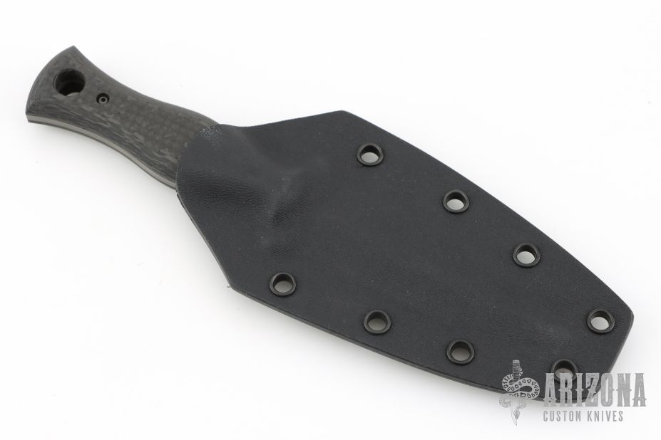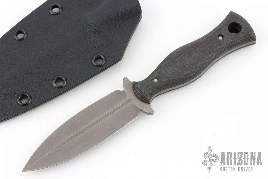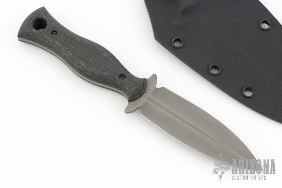 This Dagger by Chris Taylor features an acid hand rub satin finished blade with fullers, .122" Blade Stock and 1.075" Blade Depth, full tang construction. The handle features carbon fiber scales and a lanyard hole. Includes a kydex sheath. Excellent condition.