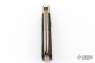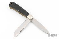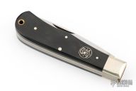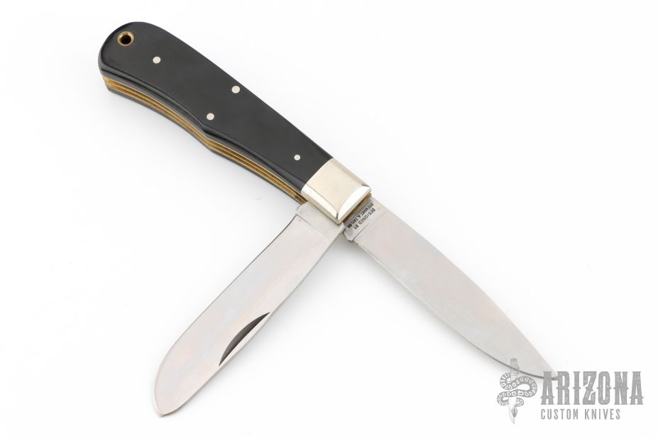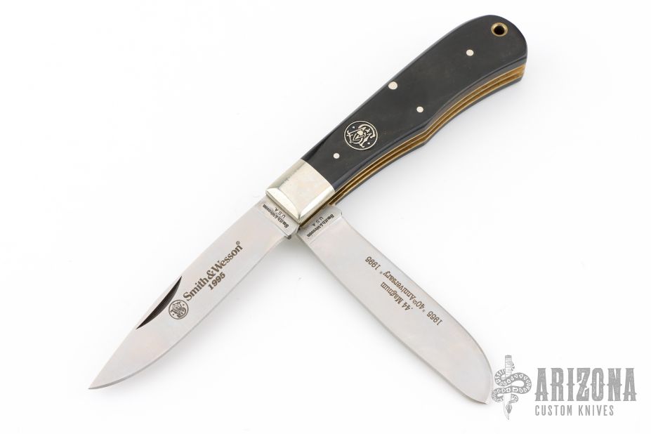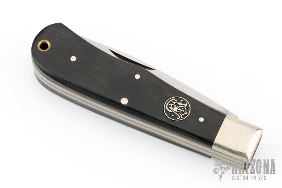 This vintage lockback folder by Smith and Wesson features mirror finished blade. The handle has nickel silver bolsters, black covers, brass liners, stainless steel backspacer. Has some scratches, otherwise excellent condition. Comes in original clamshell case.