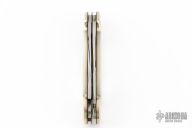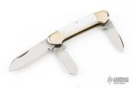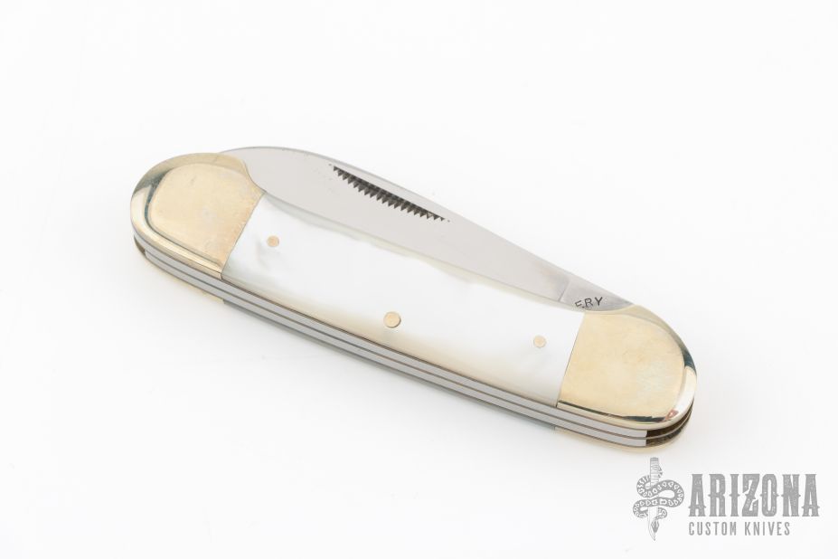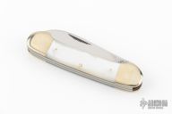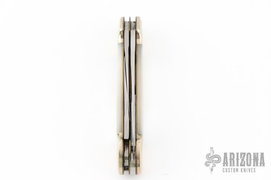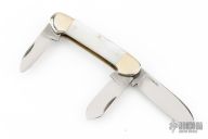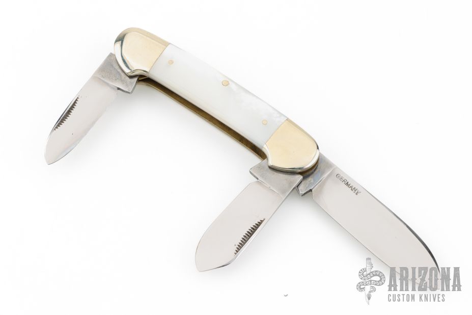 This Slipjoint from Kane Cutlery Co. features a mirror polished blades with nail nicks. The handle has nickel silver bolsters, front and rear, mother of pearl covers with brass liners and stainless steel spring. Made in Germany. Has a few light scratches, otherwise excellent condition.