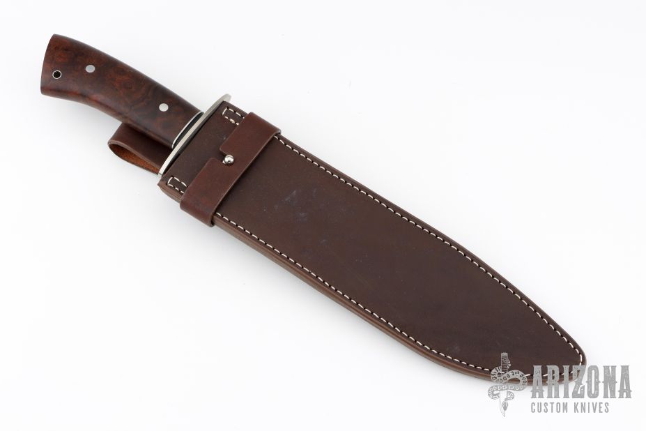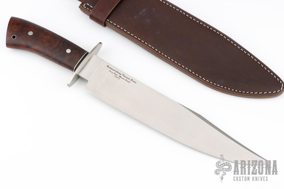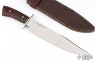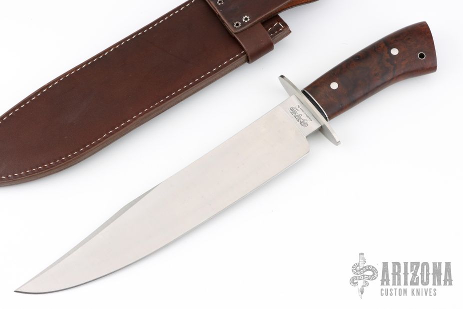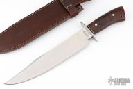 This Fisk Bowie from Camillus features a satin finished blade, 3/16" blade stock and 2" blade depth, hidden tang construction. The handle has a steel guard and desert ironwood burl handle. Comes with original box, papers, and leather sheath with frog. #650 on guard. Has some light scuffs, excellent condition otherwise.