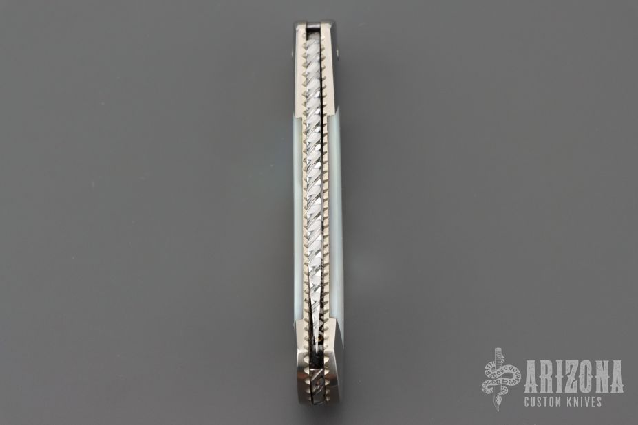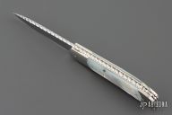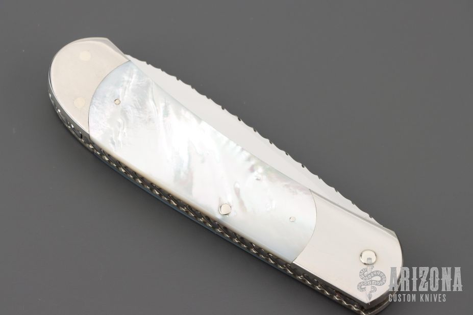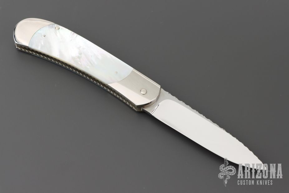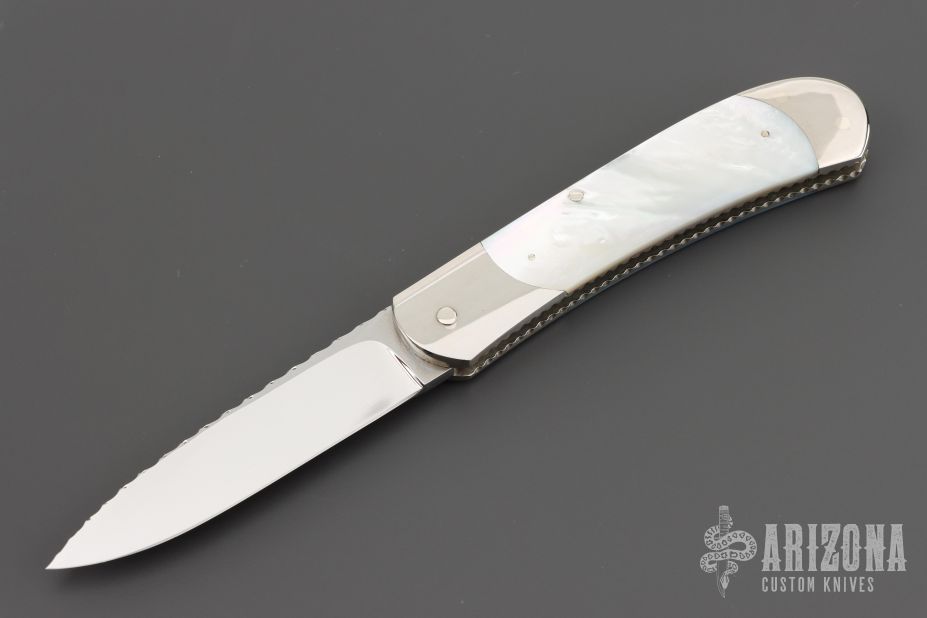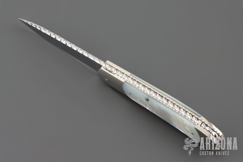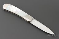 This Left Handed Palm Release Auto by Ken Steigerwalt features a mirror polished blade with fileworked spine. The handle has nickel silver bolsters, front and rear, mother of pearl scales, fileworked nickel silver liners, fileworked stainless steel backspacer. Nice action, lockup and blade seating. Excellent condition.