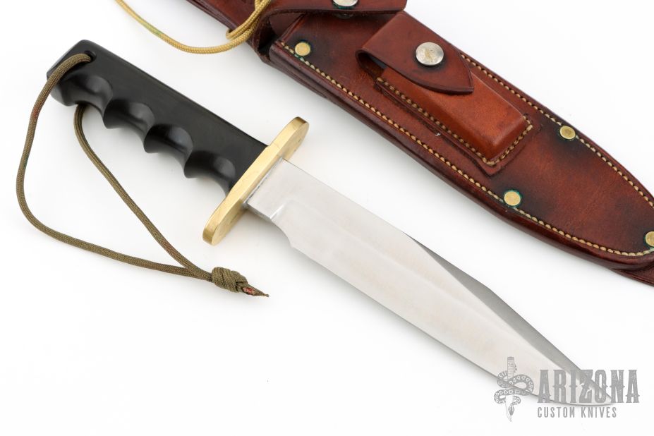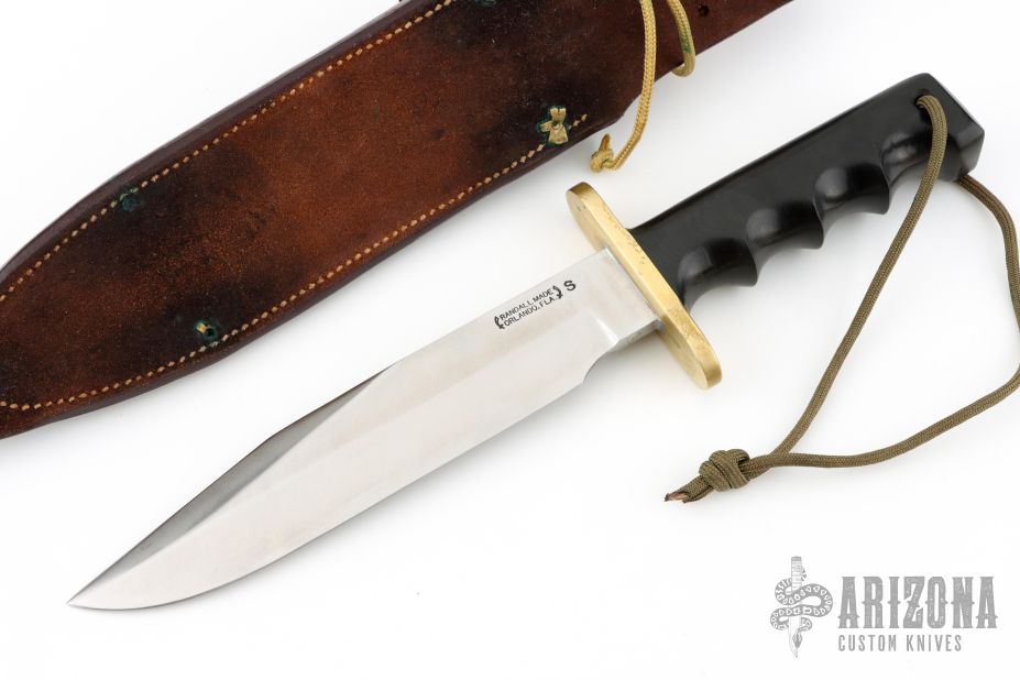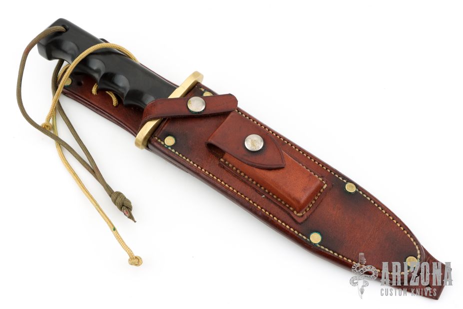This is a Vietnam Era Model 14 Attack from Randall Made Knives. Very desirable Separate S stamp, typical of the late 60s and early 70s.Brass double hilt. Black micarta 4-Finger grip handle. Unlined wrist thong hole. The knife comes with its original Brass Riveted Johnson Roughback sheath. Has a black stone marked "Combination Crystolon". This Randall would be a great addition to any collection of Vietnam Era fighting knives.