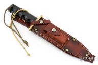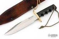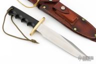 This model 14 by Randall Made Knives features a satin finished blade with sharpened top edge, .236" blade stock, 1.433" blade depth, full tang construction. The handle has a brass guard, black linen micarta handle with a lanyard hole at the butt. This knife was designed to meet the demand for an almost indestructible all-purpose knife, though it is especially suited for combat and survival purposes. Comes with brown leather sheath with brass rivets and Combination Crystolon stone. Excellent condition.