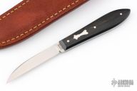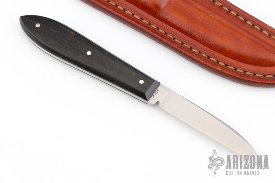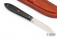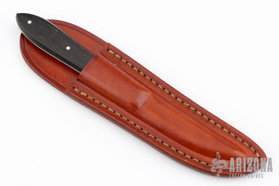 This Desk Knife by K. Hampton features a satin finished sheepsfoot blade with .095" blade stock and .47" blade depth. The handle has wood scales over full tang construction. Comes in a K. Hampton leather sheath. Has some light scuffs, excellent condition otherwise.