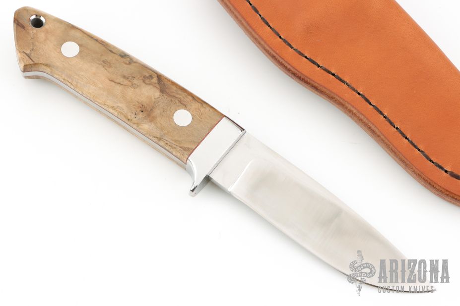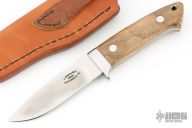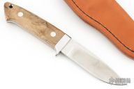 This Small Drop Point Hunter from James Sponaugle features a satin finished blade with .148" blade stock and 1.068" blade depth, full tapered tang construction. The handle has a mirror polished stainless steel single guard with chestnut scales over red liners/spacers. Includes leather sheath with belt loop. New from maker!