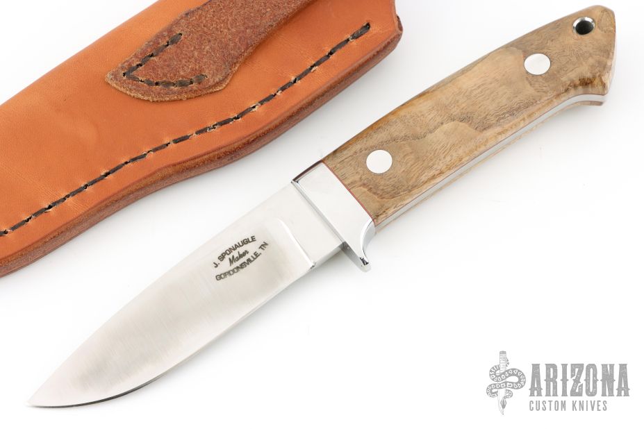 "I crafted my first knife while in elementary school and still have it today. It is a sentimental piece to me because it reminds me of my father and hunting in the mountains as a boy. Today I hand craft knives for the common hunter as well as the avid collector. I take into consideration the needs of the active hunter and add a mirrored finish and rare handle material for a knife that any outdoorsman would be proud to call his own. I have come a long way from that wooden carved knife in elementary school. Today I use a Bader grinder to hollow grind. My knives have a full tapered tang and nickel silver or stainless steel hand guards. They are professionally heat treated in an atmospheric controlled furnace. My favorite steels to work with are ATS 34 or 154CM. I have also spent the past 39 years as a tool maker at TRW in Lebanon, TN. This has been a great asset to my hobby as a knife maker. I make each knife with great attention to quality and detail as if it were my own. After seeing the knife go from raw material to finished product I'm very proud to have the Sponaugle name on it. I believe that it represents all that is desired in a true hunter's tool."