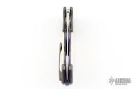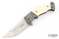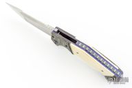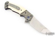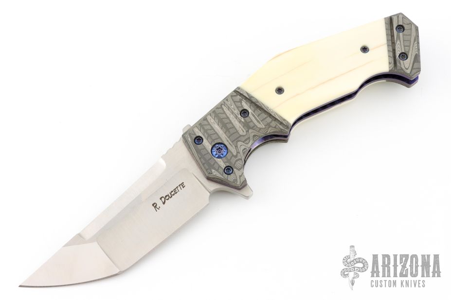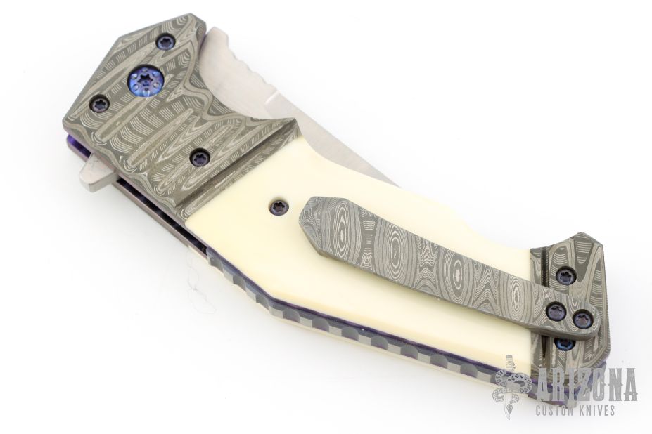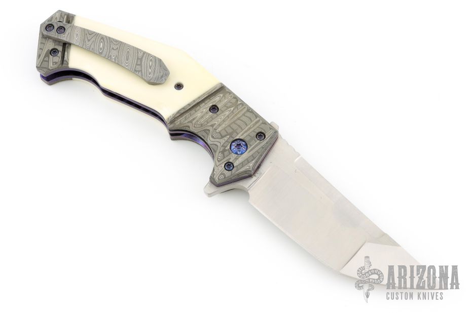 This Outlaw flipper by Randy Doucette features a satin finished blade with false top edge, notched thumbrest and flipper. The handle has fluted Damascus bolsters, walrus ivory scales, anodized titanium liners, notched titanium backspacer, Damascus tip up pocket clip, anodized titanium hardware. Nice blade seating, detent and lock up, rides on IKBS bearings. Excellent condition.