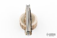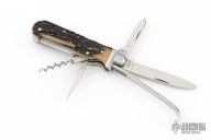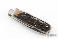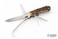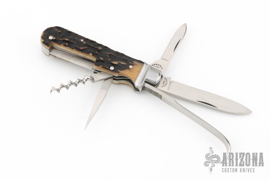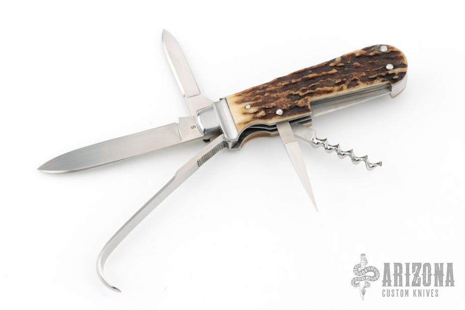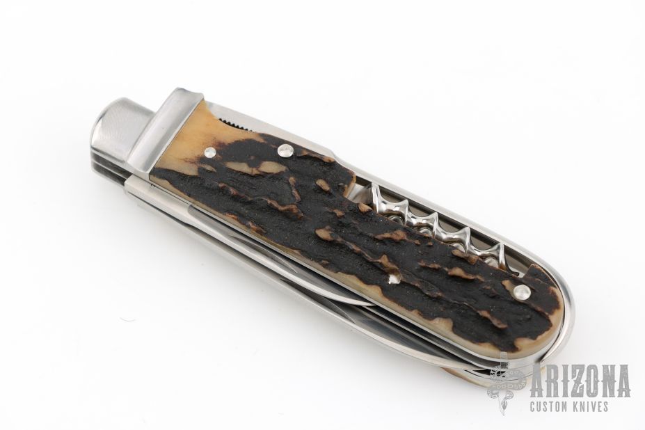 This Slipjoint by Ken Erickson features hand rub satin finished blades with nail nicks. The handle has stainless steel bolsters, stag covers, stainless steel liners and springs. Has half-stops. The two blades on the back of the knife are a triangle punch and corkscrew, has has a hoof pick. Comes with a zippered case. Excellent condition. #5