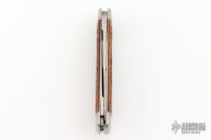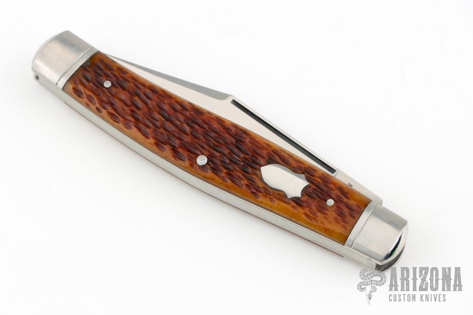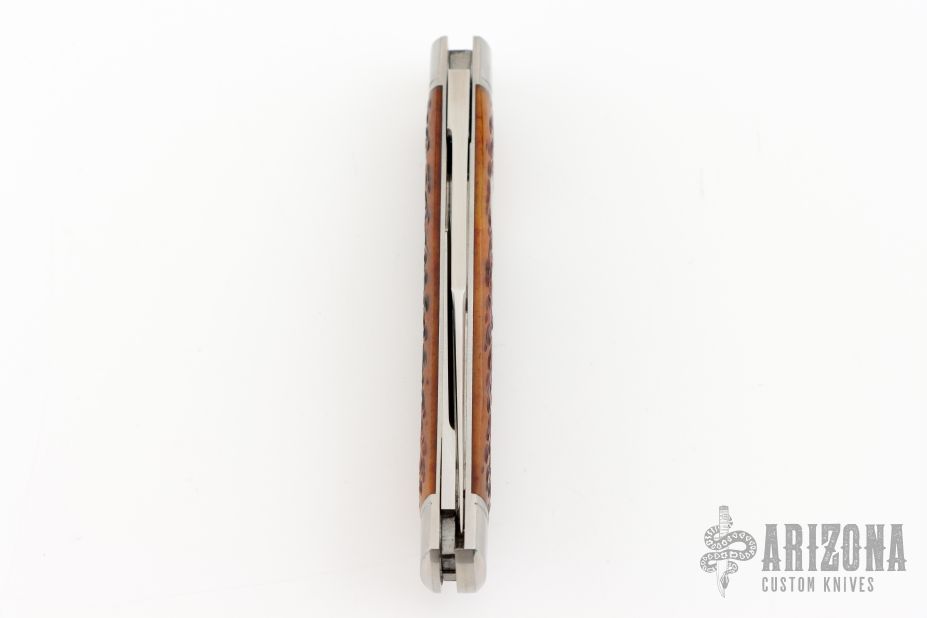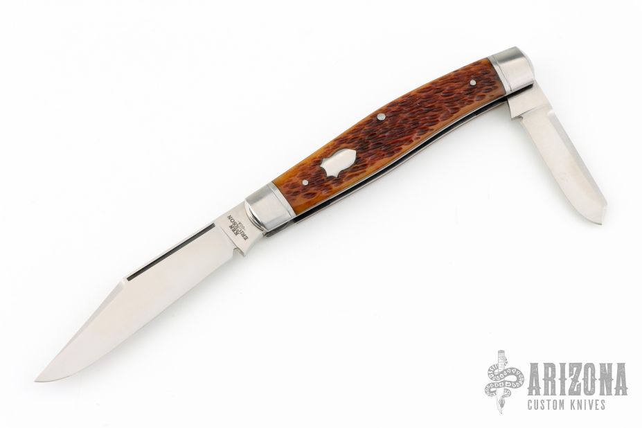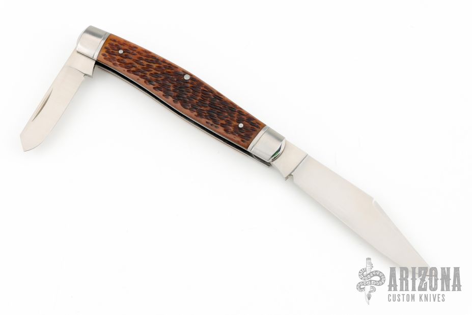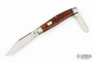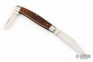 This 2-Blade slipjoint by Ken Erickson features hand rub satin finished blades with nail nick and long pull. The handle has threaded stainless steel bolsters, red jigged bone covers with stainless steel liners, escutcheon, and spring. Has half-stops, flush in all positions. Has a couple light scuffs, otherwise Excellent condition.