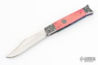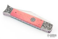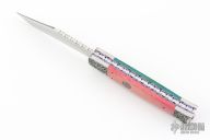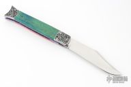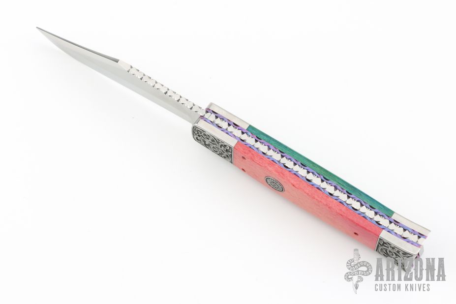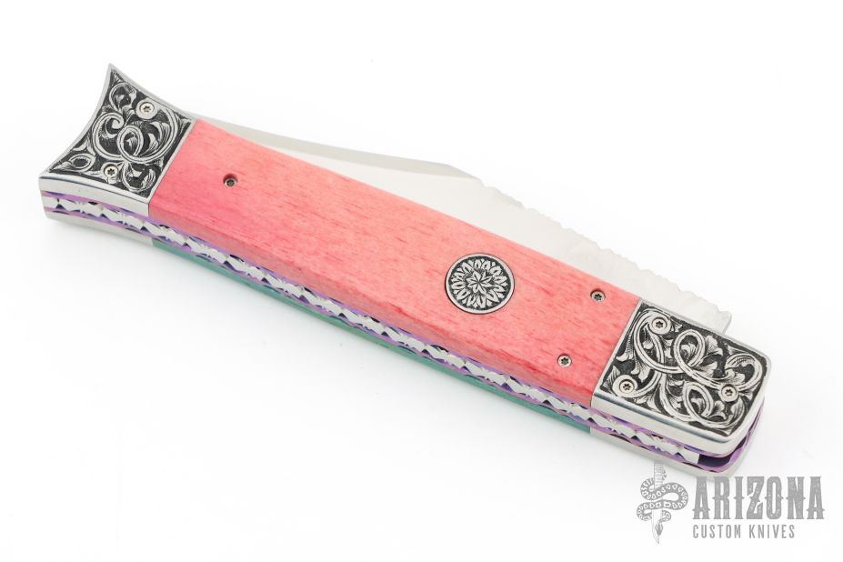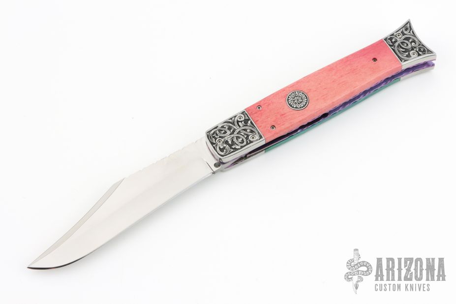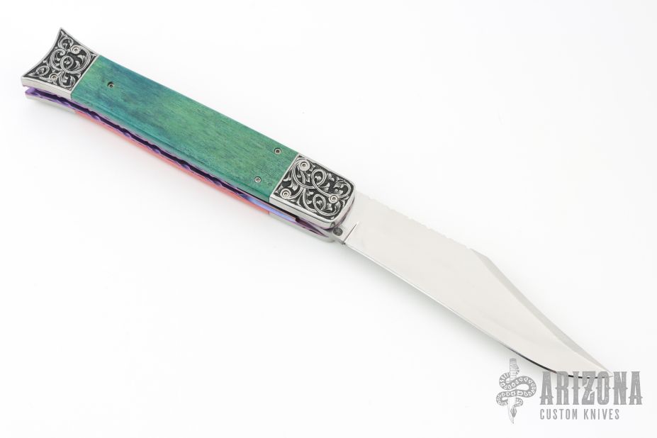This Linerlock Auto by Afaaq Custom Knives features a mirror polished blade with a false top edge and fileworked spine. The handle has engraved stainless steel bolsters, fileworked and anodized titanium liners, dyed bone scales, fileworked stainless steel backspacer, engraved push button. Comes with a leather case and COA dated 4-9-2025. New from maker!