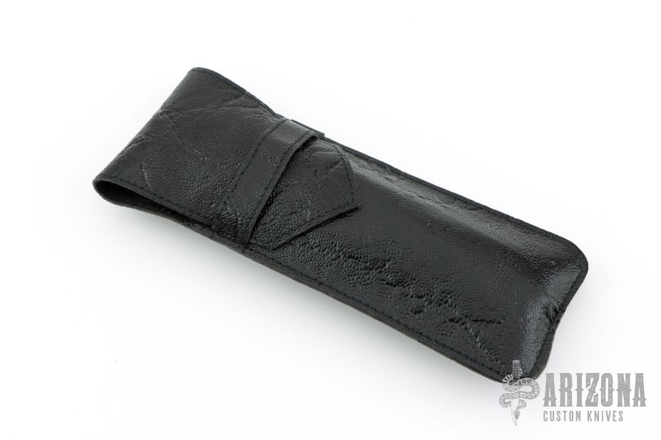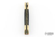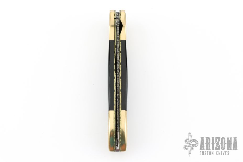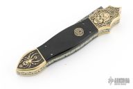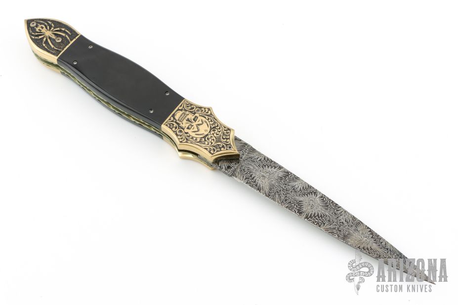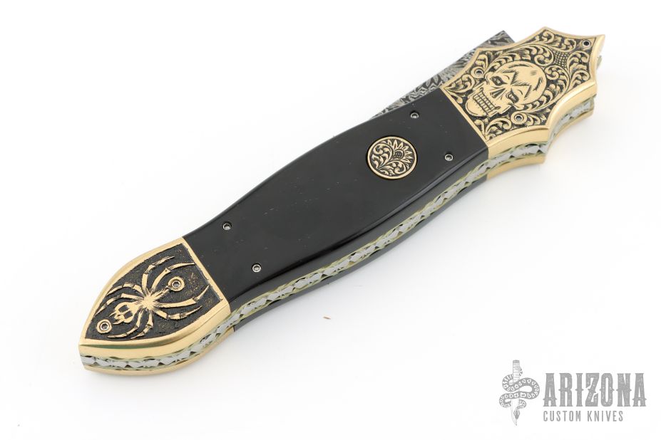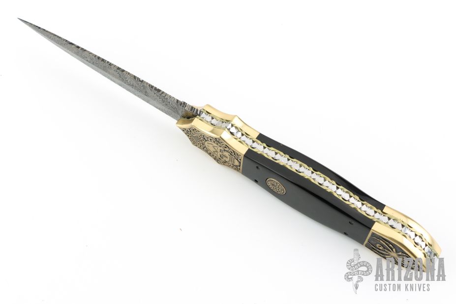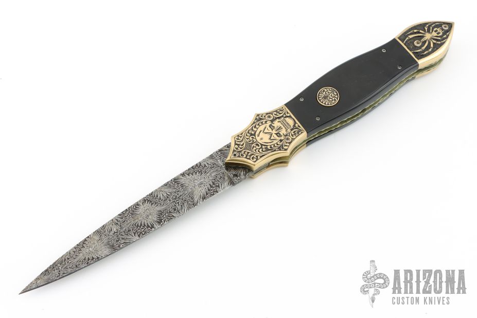 This Linerlock Auto by Afaaq Custom Knives features a Mosaic Damascus blade with false top edge. The handle has engraved brass bolsters, fileworked and anodized titanium liners, buffalo horn scales, fileworked stainless steel backspacer, engraved brass button. Nice action, lockup and blade seating. Comes with a leather case and COA dated 4-9-25. New from maker!