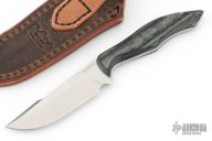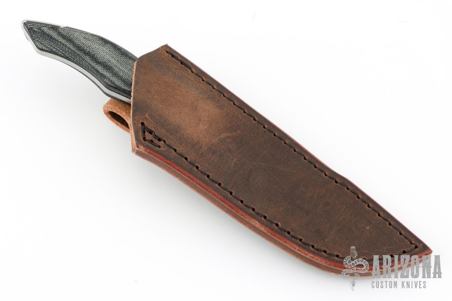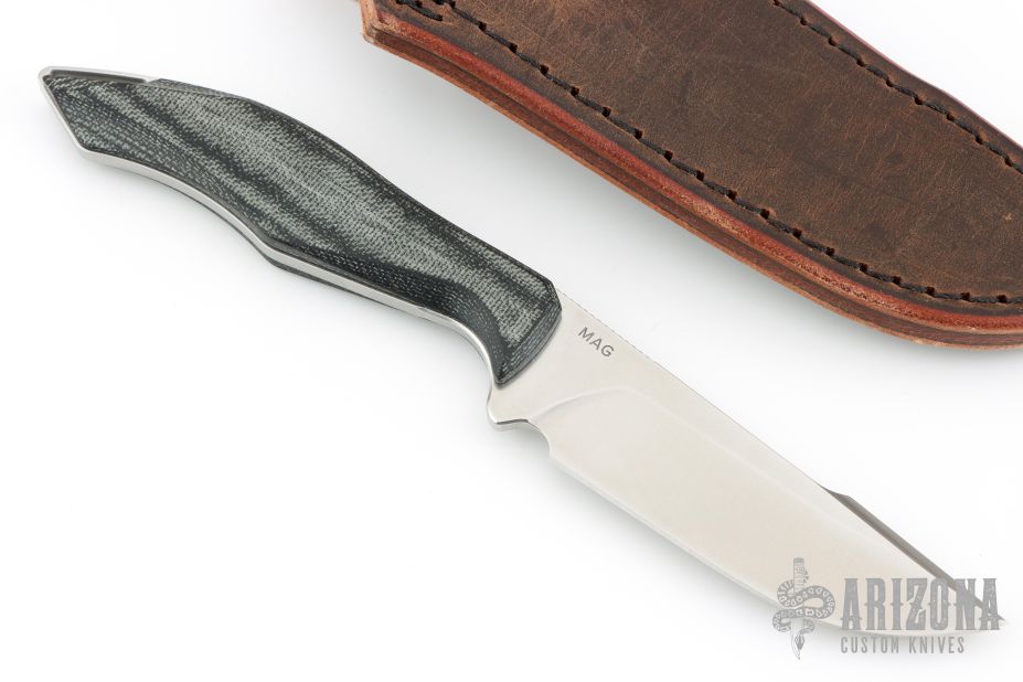 This Helo by Koenig features a brightwashed Magnacut blade with notched thumbrest and false top edge, .140" blade stock and 1.059" blade depth, full tang construction. The handle has black canvas micarta scales with hidden pins. Comes with original tube, brown leather sheath and COA dated Feb 21, 2025. Excellent condition.