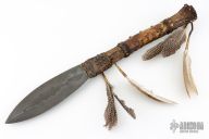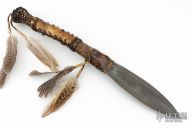 This Dagger by Wade Hougham features a hand forged blade with an antiqued finish, .171" blade stock and 2.285" blade depth, hidden tang construction. The handle is a long piece of crown stag, wrapped with leather and epoxied cord, brass stud decorations. Excellent condition.