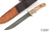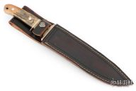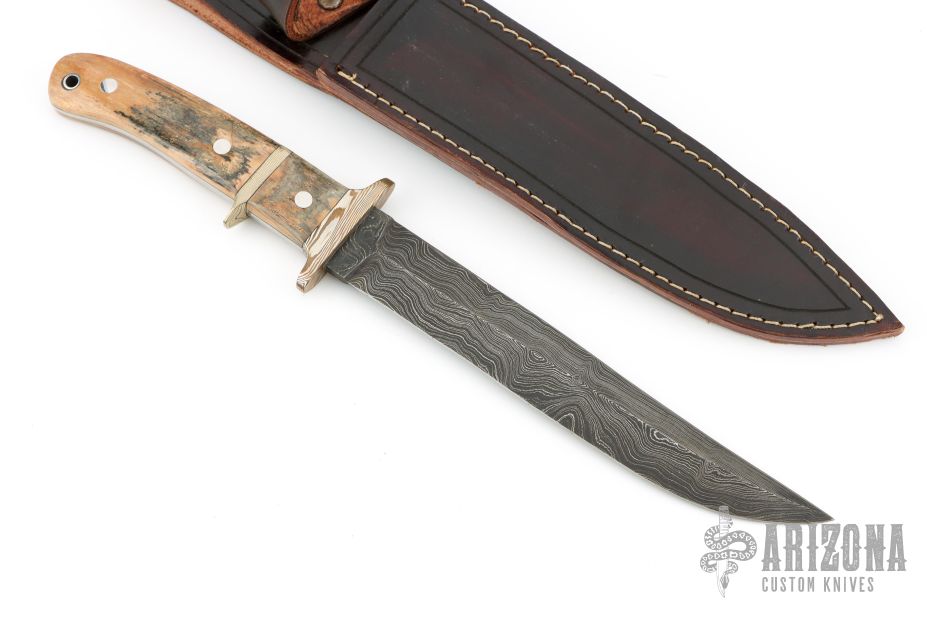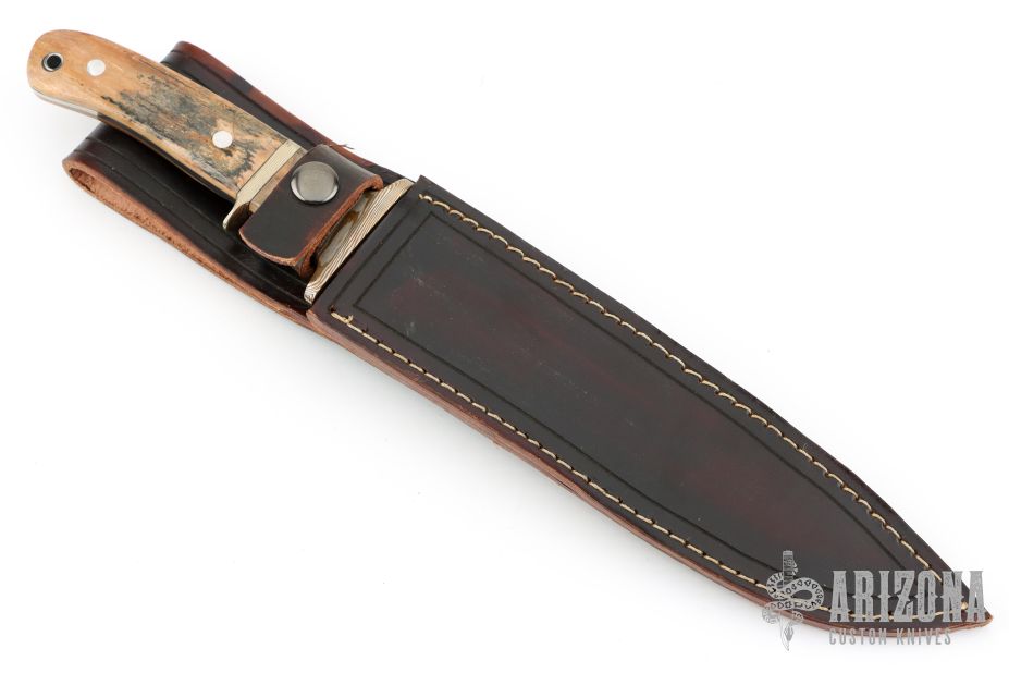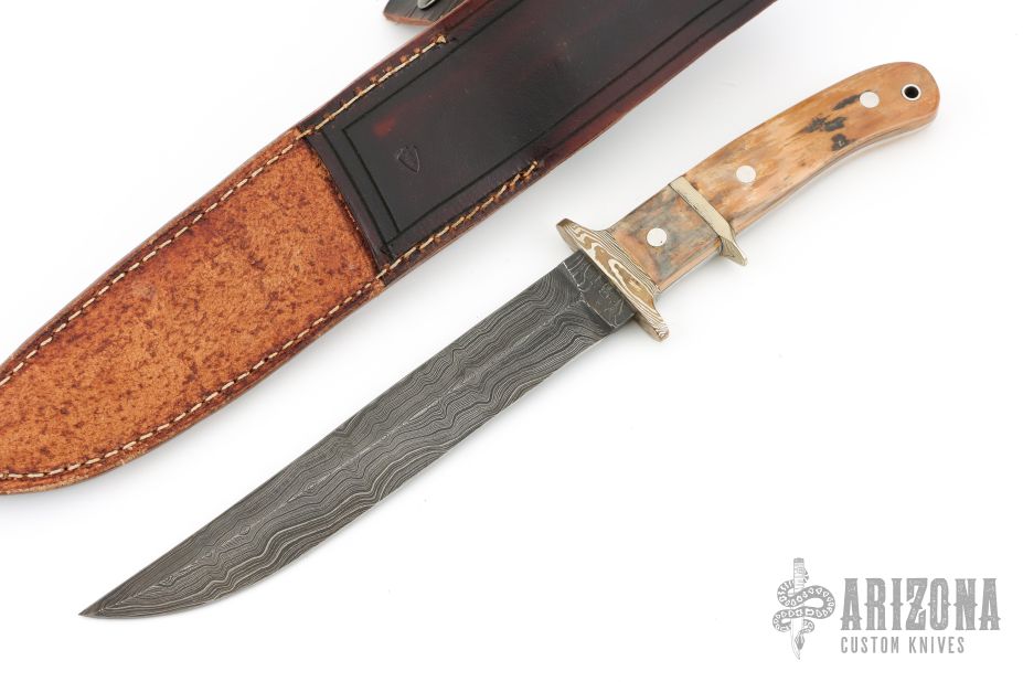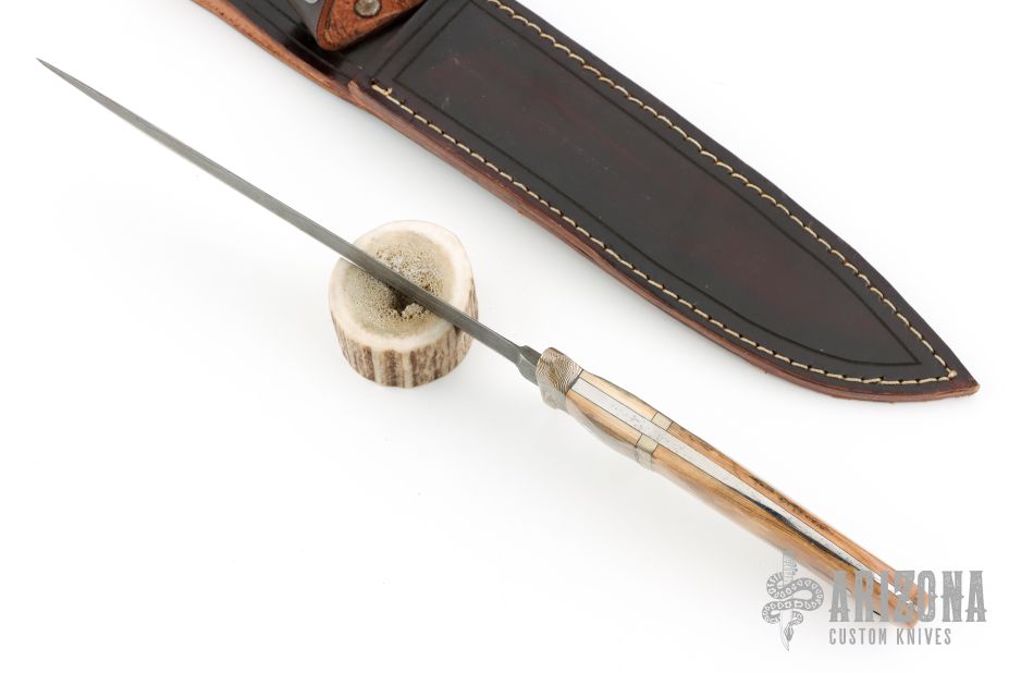 This Sub-Hilt Fighter by Wayne Hensley features a Damascus blade with sharpened top edge, .168" blade stock and 1.148" blade depth, full tapered tang construction. The handle has a mokume guard and sub-hilt, mammoth ivory scales, stainless steel pins and a lanyard hole at the butt. Comes with a black leather sheath. Excellent condition.