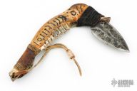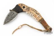 This Dagger by Wade Hougham features a hand forged blade with a forged finish, .244" blade stock and 2.282" blade depth, hidden tang construction. The handle is an elk jawbone wrapped with leather and epoxied cord, carving on the jawbone. Excellent condition.