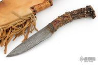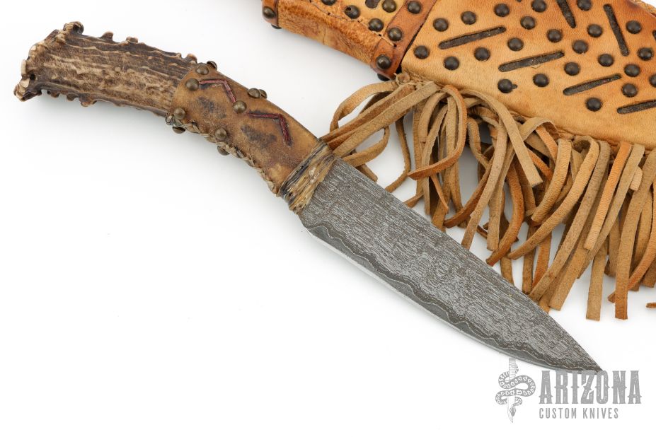 This Hunter by Wade Hougham features a San Mai blade with an antiqued finish (i think it is clad in wrought iron, but not totally sure), .221" blade stock and 1.370" blade depth, hidden tang construction. The handle has a crown stag grip with leather wrapped guard and brass studs. Comes with a brown leather sheath with decorative brass studs. Excellent condition.