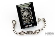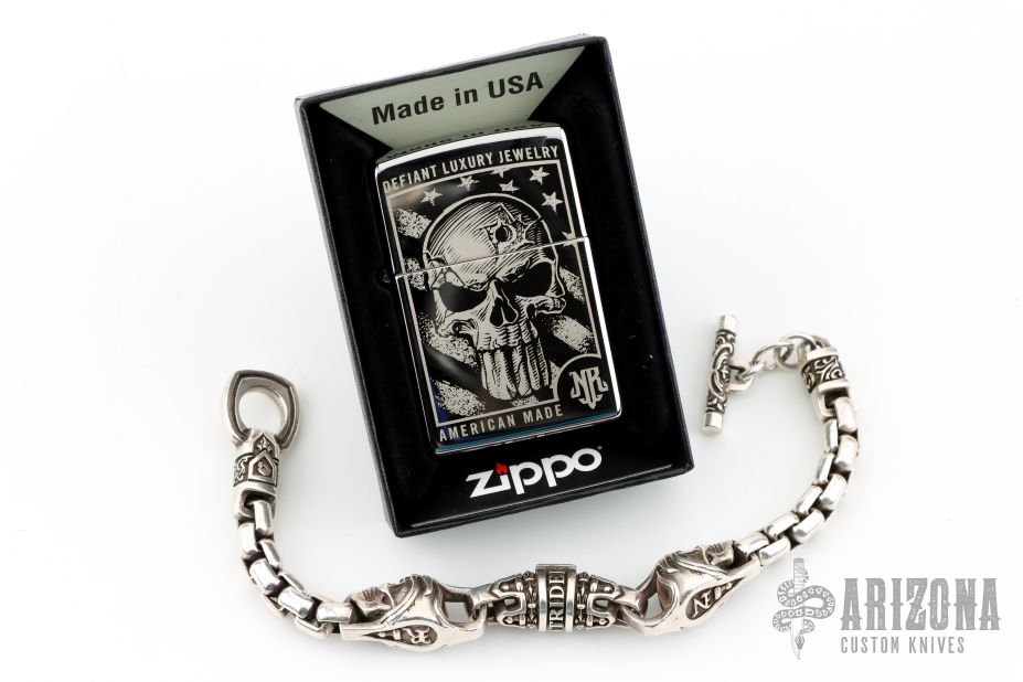 .925 Sterling Silver Royal Mortem Skull bracelet by NightRider. Comes with original box and a Zip-o Lighter with their logo (I can't use the real name or their lawyer will send us a cease and desist letter, strang that they wouldn't appreciate the free publicity, right?). Excellent condition.