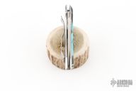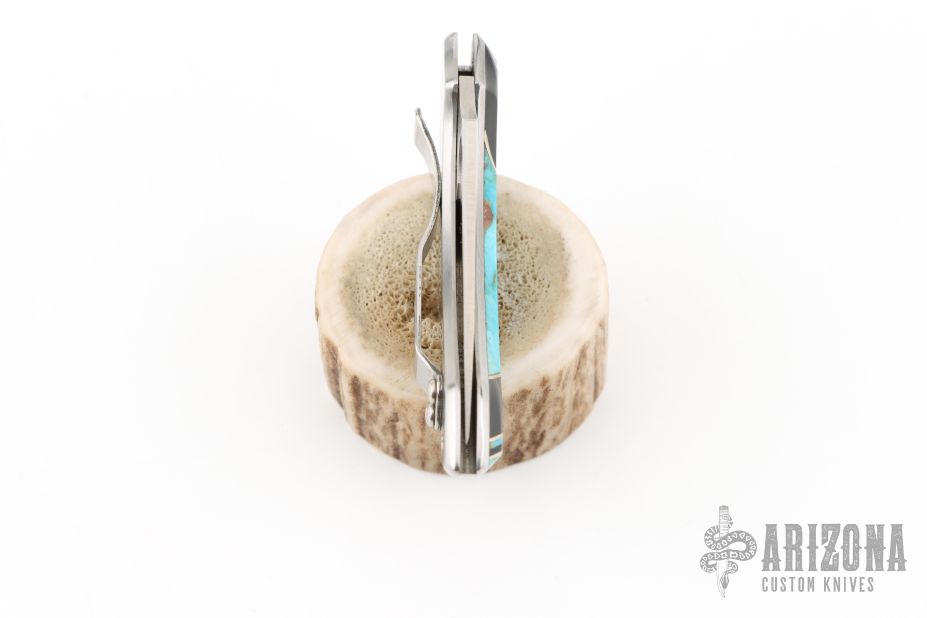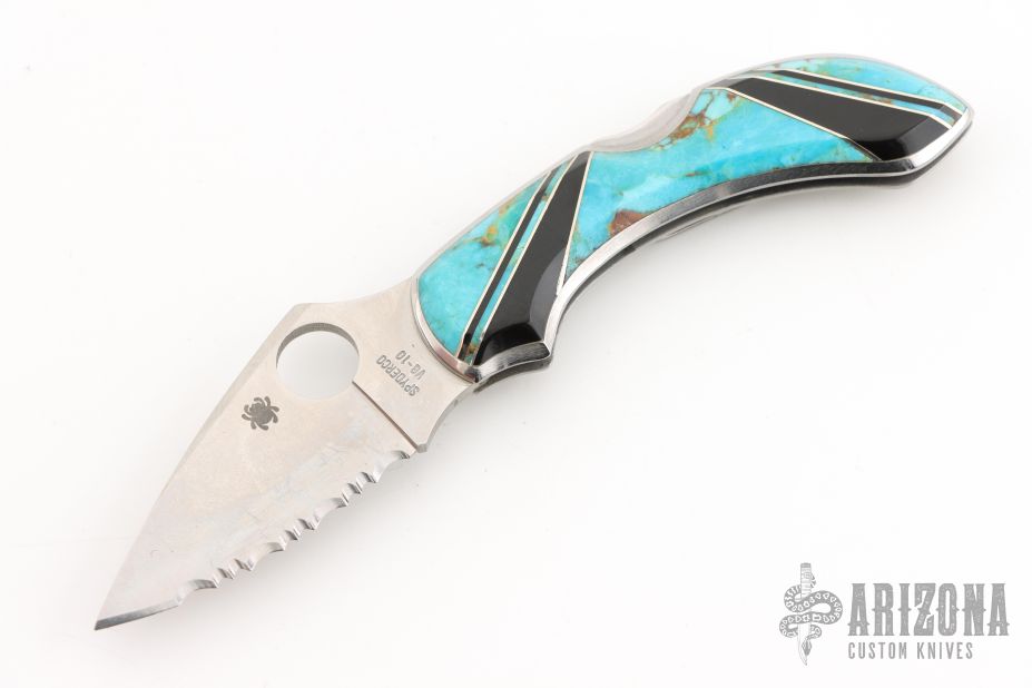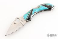 This Dragonfly Lock Back folder by Spyderco features a satin finished blade with thumbhole. The handle has a stainless steel frame with turquoise and black jet overlay, tip up stainless steel clip. Has a couple light scratches, excellent condition otherwise. Comes with original box and papers.