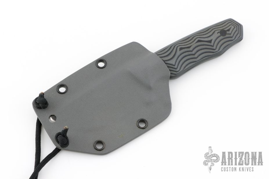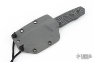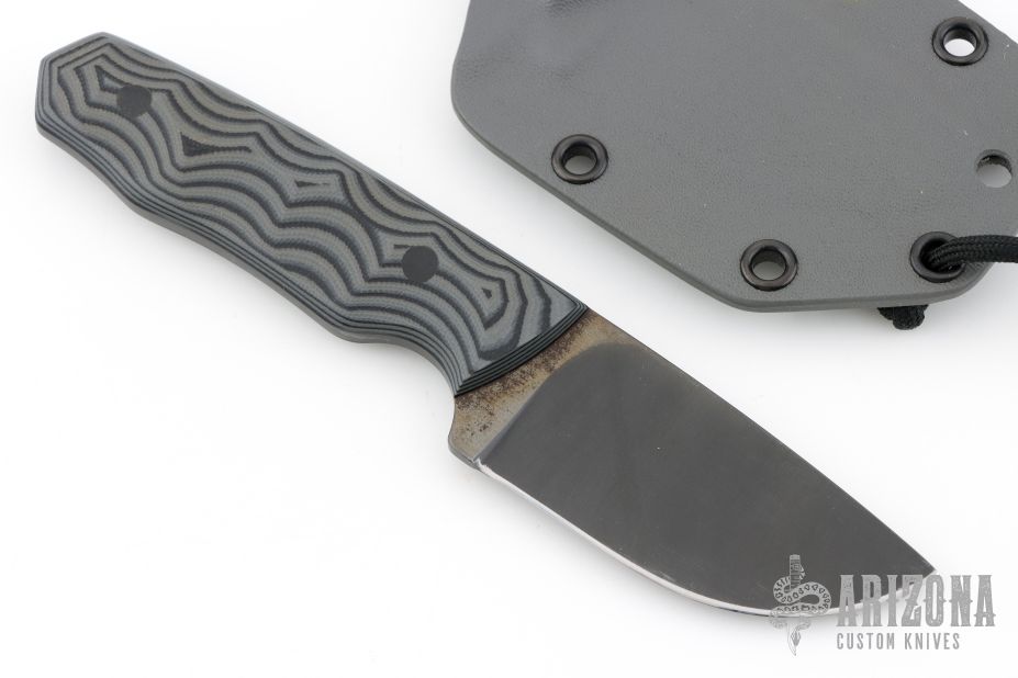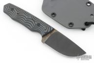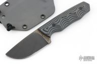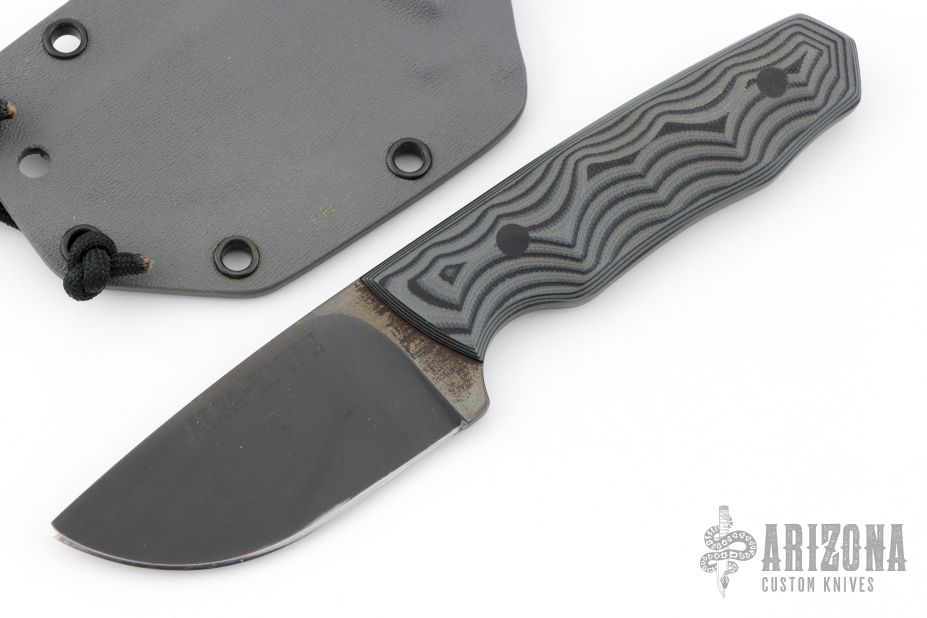 This knife by Alfa-Knife features a black blade, .125" blade stock and 1.396" blade depth, full tang construction. The handle has black/grey G-10 scales with black pins. Comes with kydex sheath. Excellent condition.