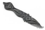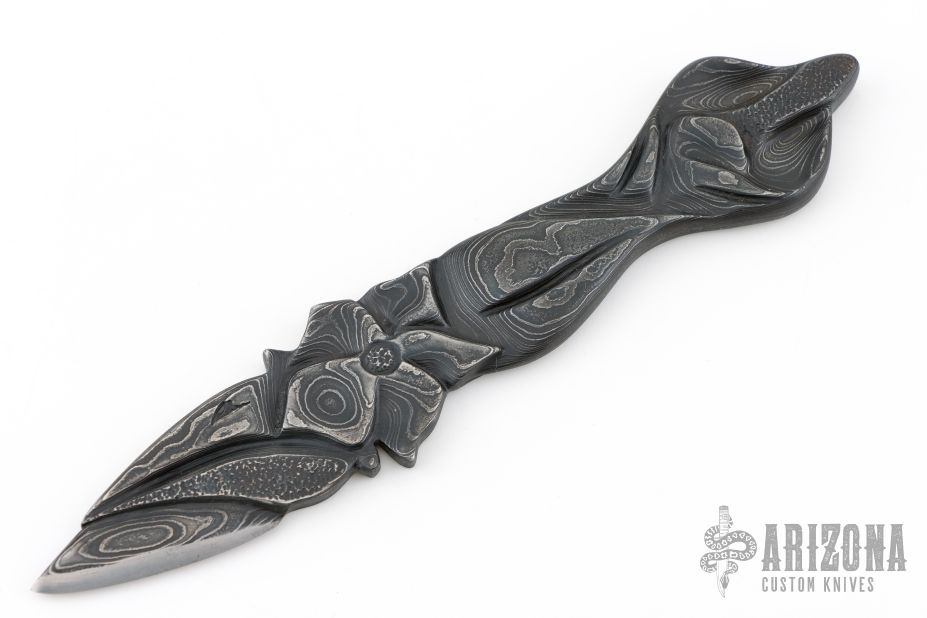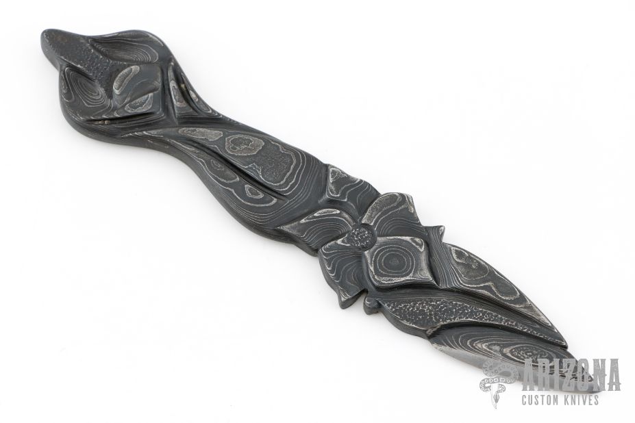 The "Black Lily" by Journeyman Smith Rik Palm is made of one piece of Damascus that has been hand carved and textured. Low count random pattern Damascus made of 1084 and 15n20, .259" blade stock and 1.055" blade depth, integral construction. Comes with COA. Excellent condition.