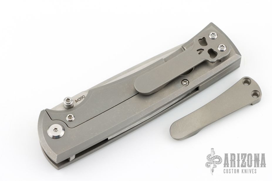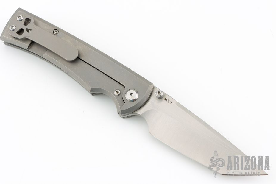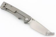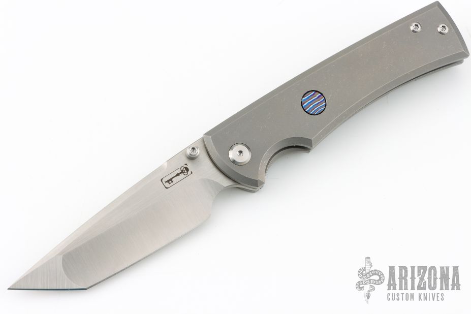 This Chaves Ultramar Liberation Tanto has been professionally converted to a side-opening automatic by Kyle Vallotton. It features a satin finished blade with the Chaves logo, a tumbled titanium frame with skull pocket clip positioned for tip-up carry, and a matching titanium backspacer. Additional details include a Mokuti push button and jeweled steel backspring. The knife comes with its original box and a spare titanium pocket clip, and is offered new from the maker.