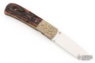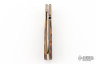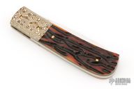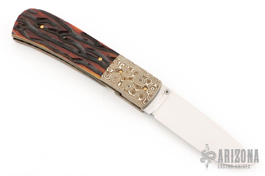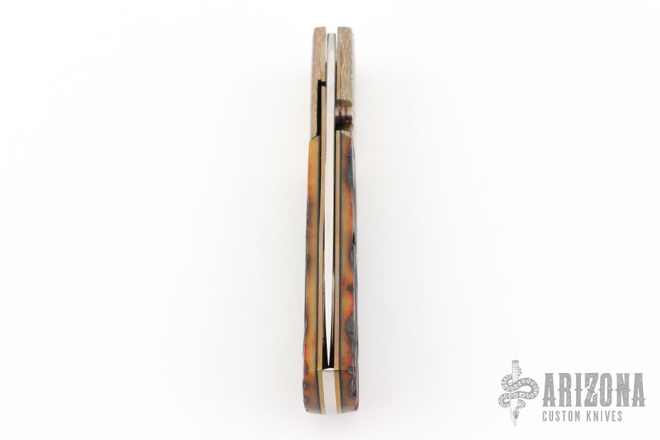 This linerlock by Steve Hostetler features a mirror polished blade with single thumbstud. The handle has mokume bolsters, jigged bone scales, anodized titanium liners with jeweled interiors, stainless steel backspacer. Nice detent, lockup and blade seating. Excellent condition.