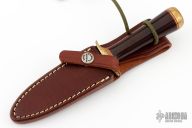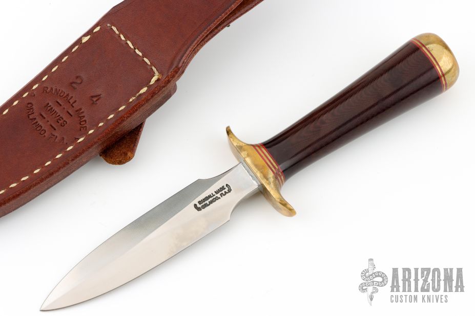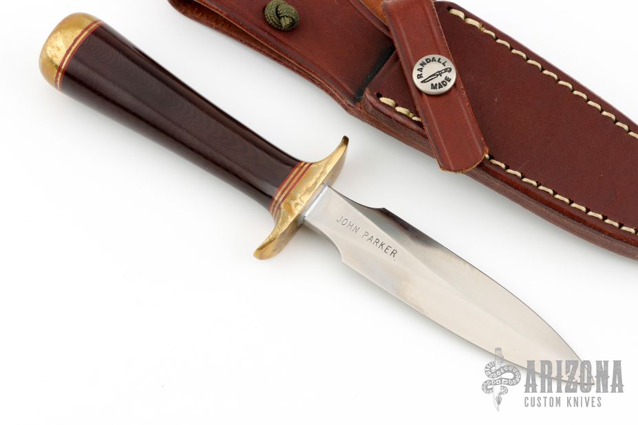 This Model 2-4 by Randall Made Knives features a satin finished double edged blade, .174" blade stock and .905" blade depth, hidden tang construction. The handle has brass guard and butt, maroon linen micarta grip with red/brass spacers. Comes with brown leather sheath. Has "John Parker" on the blade. Has some patina on the brass, otherwise excellent condition.
