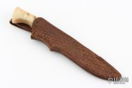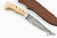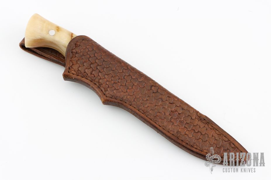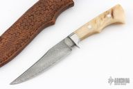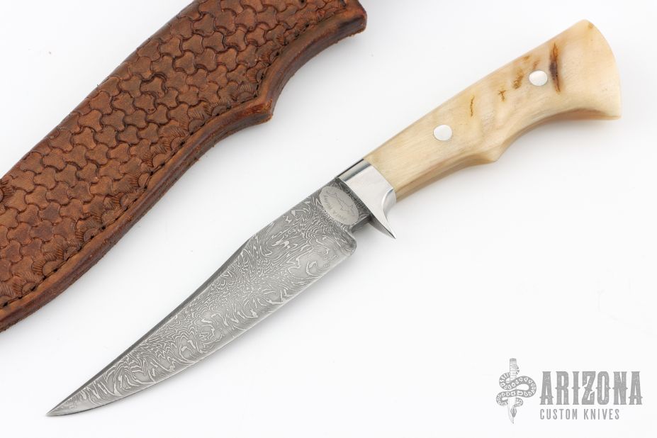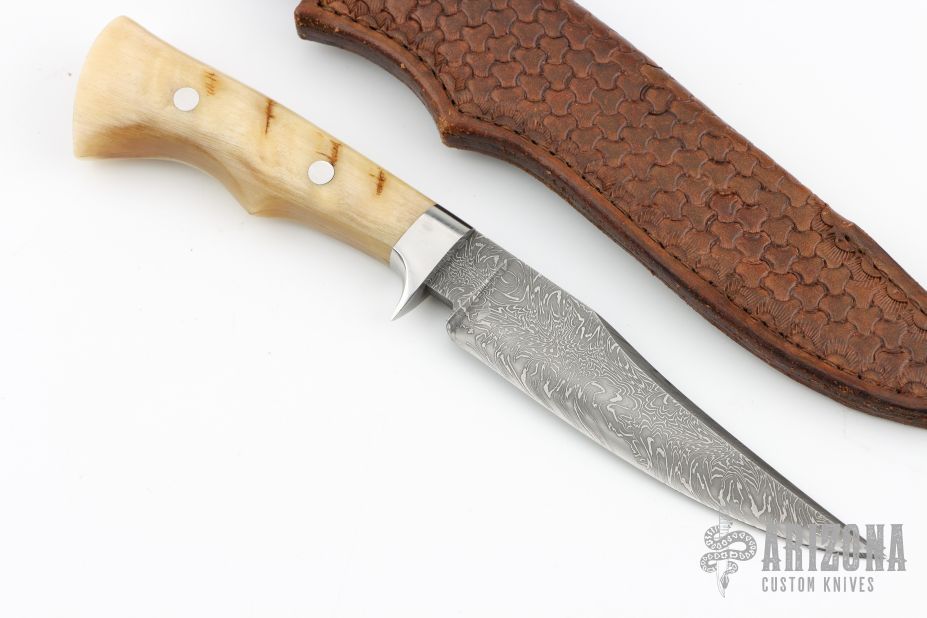 This Hunter by Journeyman Smith Joel A Worley features a Mosaic Damascus blade with false top edge, .184" blade stock and 1.034" blade depth, hidden/mortise tang construction. The handle has a stainless steel guard and a two-piece sheeps horn grip with a stainless steel pins. Comes with a hand tooled brown leather sheath. Excellent condition.