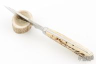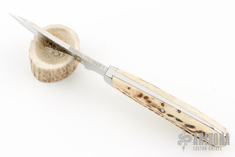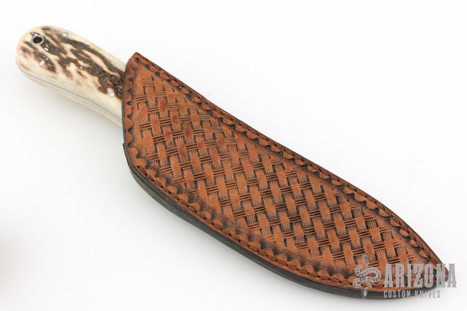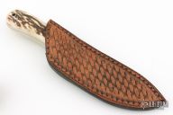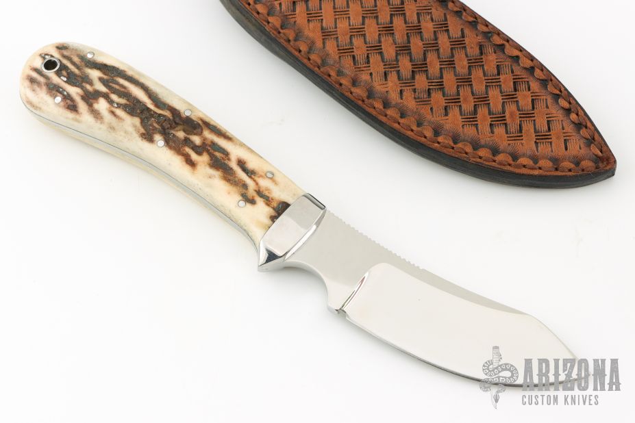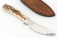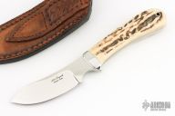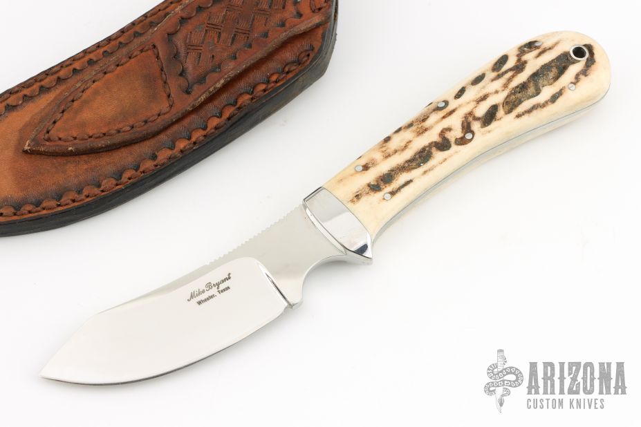 This skinner from Mike Bryant features a mirror polished upswept blade with notched thumb rest. .182" Blade Stock.  1.092" Blade Depth.  The handle has a stainless steel guard and stag scales over full tapered tang construction. Lanyard tube in pommel. Includes leather sheath with belt loop. Sheath marks on blade and guard and the scales have shrunk slightly but otherwise good condition.