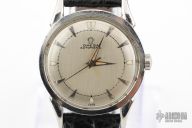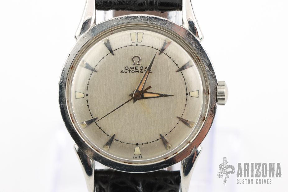 This Omega timepiece from the post-war era exhibits a dressy aesthetic in its lug shape and face design, while incorporating sporty functionalities like luminescent paint and a screw-back case with waterproof capabilities. The two-tone dial features different finishes on the inner and outer sections, complemented by wedge-shaped indexes with an embossed design, contributing to the sporty appeal. The dauphine hands at the center are luminescent, and the positioning of the two-tone switch includes minute markings printed over, allowing the seconds hand to gracefully overlap.